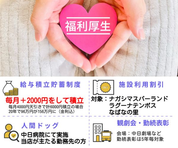 【保険制度】 雇用保険、労災保険 待遇 ◎駐車場あり ※車・バイク・自転車通勤可 ◎観劇会、勤続表彰 ◎従業員の入場料優待割引あり ※ナガシマスパーランド、ラグーナテンボス、なばなの里 ◎人間ドッグ ※当店が主たる勤務先の方 ◎給与積立貯蓄制度 ※毎月+2000円をして積立 例)毎月4000円の天引きで計6000円を積立した場合 20年で96万円が156万円になります(金利込み)
