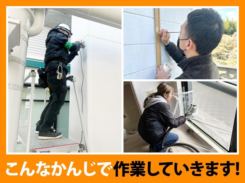 仕事内容 ◎未経験OK!毎日17時にはおつかれさま! ◎気を使わず、みんなでワイワイ働ける! ◎力仕事ナシで、体にムリなく始められる! / 「なんか楽しそうかも」 って思ってくれたら、 もうそれだけでOKです! \ うちの職場は、 みんな前向きで明るい雰囲気。 社長も先輩もフラットで話しやすく、 困っていたらすぐに「大丈夫?」 「手伝おうか?」と声をかけてくれます。 悩みごとも、仕事以外のことでも 聞いてくれるような優しさがあって、 毎日安心して働ける環境です! 難しいルールや 厳しい上下関係は一切ナシ。 経験ゼロでも、 志望理由が「なんとなく」でも大丈夫◎ 一歩踏み出してくれたら 全員でしっかりサポートします! 〰〰〰〰〰〰〰〰〰〰〰〰〰〰〰〰〰〰〰〰 【おしごと内容】 新築マンションにあるドアや窓などの “アルミサッシ”についたキズを、 キレイにするお仕事です! 基本は関西エリア(大阪・兵庫・京都)で、 1日にまわるのは1~2件ほど。 ・1日で終わるところ ・1~2ヶ月かかるところ ・定期的に行く現場 などいろいろありますが、 先輩と一緒に動くので安心です! 【ここがポイント!】 ・2人1組で作業だから安心◎ ・新築マンションの室内作業メイン! ・重たい物を運ぶことはありません! 「手先が不器用かも…」という方でも大丈夫。 ゆっくり慣れていけばOKなので 自分のペースで始められます! 【仕事の流れもシンプル!】 STEP1|まずは見て覚えるところから! → 先輩と一緒に現場へ行って、 作業の流れを知ることからスタート! STEP2|カンタンな準備作業! → 塗装の前にテープを貼るなど、 軽作業から始めます! STEP3|少しずつ作業にトライ! → 削ったり磨いたりして、 キズの補修にチャレンジ! STEP4|仕上げ作業にもステップアップ! → 最後は塗装などで ピカピカに仕上げていきます! 〰〰〰〰〰〰〰〰〰〰〰〰〰〰〰〰〰〰〰〰 【安定感バツグンで、将来も安心】 メーカーさんから 直接お仕事をもらってるので、 1年中しっかり安定した仕事量があります◎ 「今月、仕事少ないなあ…」 なんて心配とは無縁! 景気に左右されにくいから、 将来のことも安心して考えられます。 少人数の会社ではありますが、 ムリなく長く続けられる職場です! 【資格取得も会社が応援!】 「有機溶剤作業主任者」などの 業務に必要な資格は、 会社が全額サポート! 講習の費用も日当もちゃんと出ます! 【いろんなスキルが身につく仕事】 建具の取り付けやキズ補修以外にも 外装・外構工事や木製建具・鋼製建具工事、 シャッター工事、ガラス戸などの修理 といったお仕事に関心のある方にも オススメです!