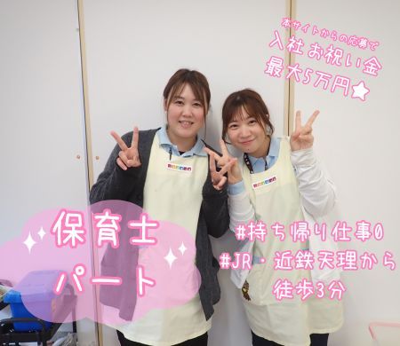 認可保育園の非常勤保育士 【入社お祝い金最大5万円】入社時期相談可能!未経験の方も安心して働けるよう、豊富な研修制度でサポートします! 【Features 特長】 経験者歓迎 扶養内勤務OK 駅チカ 小規模保育園で働く バイク・車通勤OK 新着求人 【仕事内容】 0歳児~5歳児(定員90名)の子どもたちの 年齢や成長に応じた保育業務全般を 行っていただきます。 ◎着替え、食事の補助 ◎保育環境の整備(園内清掃等) ◎保護者対応(連絡帳の作成等) ◎制作物等の作成 など ※保育記録などはICTシステムを 導入しており業務の効率化を図っています。