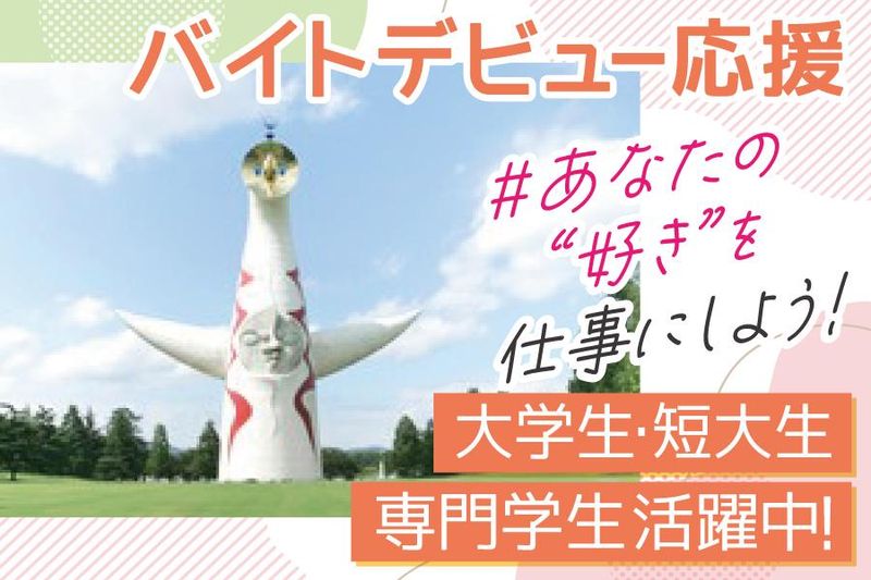 仕事内容 万博記念公園 太陽の塔での 接客や案内のお仕事をお任せします。 具体的なお仕事は… ✅太陽の塔内部観覧者の予約確認 ✅当日券の販売 ✅内部作品の簡単なご説明 ✅安全チェック&スムーズな誘導 ✅観覧中のお客さま対応 などなど <今だけ!めったにない新規募集です> 初めてのバイトの方も大歓迎! サポート体制も万全だから、初めてでも心配なし。 \「太陽の塔」でのお仕事の魅力♪ / ✨太陽の塔の中で働けるレア求人! ✨太陽の塔の魅力を伝えるやりがいあり ✨未経験OK!先輩がしっかりサポート ✨スキルUP!接客やコミュ力が自然に身につく 歴史ある空間で、 観覧のお手伝いをする特別ななお仕事! あなたの笑顔が、お客さまの思い出をもっと特別にします♪