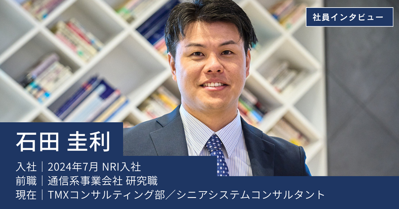仕事内容 ━━━━━━━━━━━━━━━━━━━ NRI社員インタビュー ━━━━━━━━━━━━━━━━━━━ 事業会社での「自動車×IT」の経験を武器にコンサルへ ^^^^^^^^^^^^^^^^^^^^^ 【プロフィール】 |氏名:石田 圭利 |入社:2024年7月 NRI入社 |前職:通信系事業会社 研究職 |現在:TMXコンサルティング部/シニアシステムコンサルタント ※TMXとは、Telematics & Mobility Transformationの略。 (以下、TMX部と表記) 【仕事の魅力】 ✅ 自動車✕ITの知見を活かしてプロジェクト推進 ✅ 技術研究からビジネスの世界へ ✅ 多様な仲間と挑戦できる環境 - ////////// 前職ではどのような仕事を? ////////// 通信事業者の技術部門にて、5Gの実証実験プロジェクトを担当していました。モビリティに5Gを適用するメリットを検証したり、国内外を移動しながらフィールド試験をしたりといった業務です。 私の専門である、自動車とITを掛け合わせたキャリアはここからスタートしています。モビリティーサービスのビジネス検討など、幅広い領域の経験を積ませてもらいました。技術進化の裏側を知れるのは、とても興味深かったですね。 「 自動車とITとをかけ合わせたキャリアをスタート。 未来の技術を研究開発できる環境に面白さを感じていました。 」 ////////// なぜNRIに転職を決めたのですか? ////////// 中長期的な自分のキャリアを考えると、10、20年先の技術と向き合う研究部門ではなく、ビジネスの分野に踏み込みたいと考えたのがきっかけです。転職活動では、システムコンサルタントやコンサルティングエンジニアなど、戦略に近い領域でお客様と会話し、技術側にフィードバックするようなポジションを検討していました。 前職では、通信会社と自動会社のあいだに業界的な「超えられない壁」を感じていました。それをNRIの面接で話したところ、「コンサル会社はより業界を越境したポジションだから、いままでとは異なる広い視点からプロジェクトを動かせる」という言葉をいただき、はっとしたんです。 現在の上司となる人とのこのような対話を通して、NRIのTMX部に強く惹かれ、より俯瞰的な立場で先端技術に向き合ってきたいと思うようになりました。 「 業界のしがらみにとらわれない環境で、メーカーと通信、 戦略と技術の両方を越境できる点に魅力を感じ、入社を決めました。 」 ////////// 入社後はどのような業務に携わっていますか? ////////// TMX部では、おもに自動車メーカーに対して、システム課題などの解決支援や技術検証といった、総合的なサポートを行なっています。「『自動車×IT』の課題はなにか。将来的にはどうあるべきか」など、論点の中核を考えるという点では、前職の経験を活かせていると感じます。 クリティカルな課題を見つけ、方針を固め、課題解決を推進していくことは前職の研究開発と似ているのですが、そこにさらにコンサルとしての仮説検証型の動きが求められます。上位レイヤーの方たちと対話することも多いため、情報や時間が限られた中で、沢山ある論点の中から優先順位を決め、ロジカルに整理することが求められます。 顧客とすり合わせながら進めていく必要があるため、脳的な瞬発力や体力が求められていると思います。常にレベルアップしていくことが大事で、今まさに取り組み、頑張っている領域です。 ただ、こういったコンサルタントとしての業務は初めての経験でしたので、先輩や上司に指導を受けながら、実際のプロジェクトの中で勉強を重ねて、「システムコンサル+技術開発」の両軸を担うことができています。 「 前職の経験だけでなく、学生の頃のアメフト部での経験や インターンで講師をやっていた経験など、いままでの様々な経験が 今の仕事につながっていると感じます。 」 ////////// TMXの職場環境について教えてください。 ////////// 基本的に4つのグループに分かれているのですが、プロジェクトに合わせてグループや組織横断でさまざまなメンバーと組んで仕事をしています。また、私のグループは通信事業者や自動車会社など、事業会社出身で多様な専門的バックグラウンドを持つ人が集まっていて、自分の得意領域を活かしている人が多い印象です。 週次で案件の共有会が行なわれたり、定期的に部内ワークショップが開催されたりと、お互いの業務に対して理解を深める機会もたくさんあります。立場に関係なく、ざっくばらんに意見が言い合える雰囲気も嬉しいです。 入社時は、コンサルタントとして顧客向けのトレーニングもあったので、自分の課題にしっかり気づける仕組みが整っていると感じました。自ら学ぶことも求められるので、とても成長できる職場だと思います。 「 自分の核となる強みと、 メンバーの技術領域のナレッジを組み合わせることで、 新たな化学反応が起こるのが楽しさですね。 」 ////////// 今後のキャリアや目標を教えてください。 ////////// まだ顕在化していないもやもやとしたレベルの相談からでも、丁寧に課題に落とし込ん