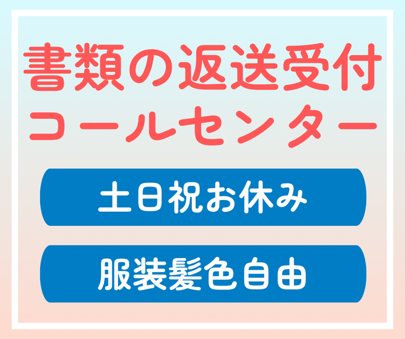 仕事内容 クレジットカードをご利用中のお客様から、 書類の返送方法に関する問い合わせに対応頂きます。 <具体的な対応例> お客様:「書類が届いたのですが、返送は必要ですか?」 あなた:「返送が必要でございます。必要箇所を記入の上、返送をお願いします。」 お客様:「書類の記入方法が分からないので教えて欲しいです」 あなた:「承知いたしました。ご記入いただく箇所は○○になります。」 お客様:「電話があったので折り返しました」 あなた:「ありがとうございます。書類送付の件でお電話させて頂きました。 お手数ですが到着している書類を記入の上、ご返送をお願いします。」 <安心ポイント> ✅ すべて【トークスクリプト】【FAQ】【対応フロー】完備! ✅ すぐ近くに管理者がいて、困った時はフォローしてもらえます♪ ✅ 対応履歴の入力もフォーマットに沿って記入するだけ! <こんな方にオススメ!> ・人と話すことが好きな方 ・安定した環境で働きたい方 ・未経験からオフィスワークを始めたい方 ・困っている人の力になりたい方 研修もバッチリで安心スタート! まずはお気軽にご応募くださいね♪