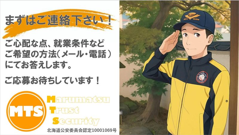 仕事内容 道路や建設現場などで車や歩行者の安全を守る交通誘導警備のお仕事です。 「こちらからどうぞ!」と車や人を誘導するシンプルな作業なので、未経験でも安心して始められます。 最初は先輩スタッフと一緒に現場に入るので、道具の使い方や立ち位置なども一から丁寧に学べます。 現場は札幌市内・近郊が中心で、直行直帰OK!マイカー通勤もOK! 具体的な業務内容 車や歩行者の安全誘導 工事車両の出入りの案内 駐車場やイベントでの誘導 など どの現場でも「ありがとう」と感謝される、地域の安全を支えるお仕事です! ここがポイント! 未経験スタート大歓迎! 研修で基本から学べる安心環境 日給保証あり 制服・装備品は全て貸与 現場へ直行直帰OK(車・バイク通勤可) 資格取得支援制度あり(交通誘導2級など) こんな方におすすめ! 安定した仕事を長く続けたい 体を動かす仕事がしたい 空いた時間を有効に使いたい(副業・WワークOK) 定年後も現役で働きたい 先輩スタッフの声 「未経験で始めたけど、研修でしっかり教えてもらえたので安心でした!」 「屋外の仕事だから健康的!人から感謝されるのも嬉しいです!」