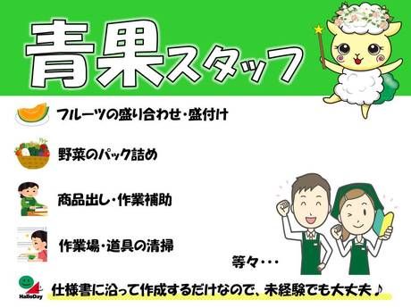 仕事内容 スーパーのバイト未経験の方にもオススメの青果部門スタッフ!アルバイト・パートをお探しの方必見! 野菜・果物の加工及び袋詰めがメインのお仕事です。 青果未経験者でもしっかり指導いたしますので大丈夫!主婦パートさん活躍中!ブランクOKなので安心して応募してくださいね。 「自宅との距離が近いから働こうかな」「経験を生かして働きたい!」働く理由は何でもOKです! 「学校が近いから、授業が終わってから」「平日の夕方まで…」「フルタイムで働きたい!」どちらも大歓迎!今活躍しているスタッフは、学生や主婦、フリーターが多数。みなさん、空き時間をうまく使って働いているんですよ。いろいろな働き方ができるハローデイのスーパー店舗スタッフとして働いてみませんか?アルバイト・パート大募集です! 「スタッフが働きやすい店舗」「お客様が楽しくお買い物ができる店舗」がコンセプトになっています。 お子様連れのお客様からシニアの方まで、様々なお客様がご来店されます。どなたでも楽しく、便利にお買い物していただけるような工夫も、店舗スタッフのお仕事なんですよ。また、安全性の確保・お客様の笑顔のため、楽しく美味しい商品を「新鮮に、安全に」お届けしています。お客様とスタッフ、どちらも満足できるスーパーを目指しています。 未経験大歓迎!しっかり丁寧にサポートするので、不安な方もご安心ください。 仕事の進め方は先輩スタッフが丁寧にお教えするのでご安心ください。スーパーでのお仕事経験のある方はもちろん、未経験の方も大歓迎!できることからスタートしましょう。 スーパーマーケットを運営するハローデイ。全店を挙げて、社会貢献活動にも積極的に取り組んでいます。 店づくりにおいては、「見学者の多い店」として評価されているんです。店舗運営のみならず、募金・リサイクル活動も行い、地球にやさしい企業を目指しています。あなたもそんなボンラパスの一員として働いてみませんか?