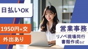 インフォメーション 外出多めでリフレッシュ*20~30代多数活躍* PC基本スキルでOK≫テキパキ!営業サポート 今回は、リノベーションマンションの企画販売などを行う大手グループ企業で事務のお仕事をご担当いただきます。 社内での事務作業+現地調査や写真撮影など、、外出も多めで《動き多めの事務》がお好きな方にもおすすめです! 少しでも気になった方、ぜひご応募お待ちしております! *レゾナゲートはご来社不要!WEB登録可能です! 給与日払い制度「Res給」&週払い制度「前給」あり!スマホでできちゃう無料PC講座も多数実施中* アピールポイント 株式会社レゾナゲートの求人を見ていただきありがとうございます! ◆当社の特徴1 WEBで完結・来社不要! ◆当社の特徴2 高水準・高時給のお給料&待遇! ◆当社の特徴3 最短翌日入金! 日払い制度「Res給」・週払い制度「前給」あり! ◆当社の特徴4 あなたもご家族も安心!健診サポート! 株式会社レゾナゲートでは 一般事務やデータ入力のお仕事だけでなく コールセンターでのテレフォンオペレーターや WEBディレクター、デザイン制作などクリエイティブ系のお仕事まで幅広くご紹介ができます! 「週2~、週3~で働きたいけどどうだろう・・」 「アルバイトやパートの経験しかないから不安・・・」 「ブランクあるけどどうだろう・・・」 ぜ~~んぶお気になさらず! あなたに合ったお仕事をご紹介します! ハローワークでお仕事をお探し中の方も こんな仕事ないかな?という方も お気軽にお問い合わせください!