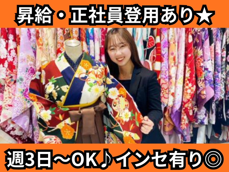 仕事内容 ✅主婦さん・フリーター活躍中! ∟お仕事復帰応援!ブランクもOK ✅新上限「年間123万円以内」での調整可 ∟扶養控除内に収まるよう勤務調整可能 ✅週3日〜勤務OK ∟「週休4日」や「週休3日」も叶う ✅駅チカで通勤楽々♪交通費規定支給 ∟JR茨木駅より徒歩5分 ✅研修・マニュアル・サポート体制充実! ∟在職中のスタッフの9割が未経験スタート …などなど 働きやすさとメリット満載の職場です! ・・・・・・・・・・・・・・・・・・・・・・・・・・・・・・・・・・・・・・・ ✨京都さがの館とは…  ̄ ̄V ̄ ̄ ̄ ̄ ̄ ̄ ̄ ̄ 京都さがの館では人生の節目や特別な日を 迎えるお客様にぴったりの和装を提案し、 レンタルから販売まで行っています。 ✨お任せする業務内容  ̄ ̄V ̄ ̄ ̄ ̄ ̄ ̄ ̄ ̄ *お客様の窓口受付 (来店受付、電話応対、メール対応等) *予約プランの確認、事務作業 (書類の作成、コピー、契約内容の確認) *着付けの準備のお手伝い (コーディネート提案、相談含む接客) *お会計 *店舗清掃など 卒業式・成人式という「一生に一度」の イベントに立ち会える特別なお仕事です。 お客様が晴れ姿になるまでのワクワクを、 あなたがサポートしてみませんか? ・・・・・・・・・・・・・・・・・・・・・・・・・・・・・・・・・・・・・・・ ✨9割以上が未経験スタート  ̄ ̄V ̄ ̄ ̄ ̄ ̄ ̄ ̄ ̄ ̄ ̄ ̄ マニュアルや研修が充実! まずは簡単なお仕事からお願いします <充実の研修をご用意>――――――――― 着付けの基本/着物の構造について (長襦袢、帯、帯揚げ、帯締めなど) メンテナンス・管理方法(着物の畳み方等) ―――――――――――――――――――― 仕事を通じて自然と覚えていただけます。 ・・・・・・・・・・・・・・・・・・・・・・・・・・・・・・・・・・・・・・・ ✨こんな働き方が可能です  ̄ ̄V ̄ ̄ ̄ ̄ ̄ ̄ ̄ ̄ ̄ ̄ 「週の半分くらいの勤務がいいな」 ▼ 土日含む週3日~勤務OK! 勤務曜日の固定も可能です。 「日曜日は保育園がお休みなので、 土曜日なら出勤できます!」などの ご事情も配慮◎ 「働く日はしっかり集中して働きたい」 ▼ 基本的には1日8時間のフルタイム勤務を お願いしていますが、 「扶養控除内に収めたい!」 「扶養の上限ギリギリで調整したい!」 のご要望にもお応えいたします♪ 扶養内に収めるために… ⭐1日1時間程度短い勤務OK(実働7時間) ⭐上限内での勤務日数・勤務時間調整 お気軽にご相談ください ・・・・・・・・・・・・・・・・・・・・・・・・・・・・・・・・・・・・・・・ ✨職場の雰囲気  ̄ ̄V ̄ ̄ ̄ ̄ ̄ ̄ ̄ ̄ ̄ ̄ 子育てが落ち着いた40代の 主婦スタッフさんや、未就学児の育児に 奮闘中の30代ママさんスタッフが活躍中! 結婚から子育てのブランクを経て 活躍されている方が多いので 家事・育児と仕事の両立に 理解のある職場です♪ 最近では20代の女性フリーターさんも 入社してくれました♪ ・・・・・・・・・・・・・・・・・・・・・・・・・・・・・・・・・・・・・・・ ⏩会社について⏩ 京都さがの館を運営する「株式会社京繊」は 明治33年創業と120年もの歴史を誇ります。 近年は有名芸能人や インフルエンサーを広告塔に起用したり、 大規模ファッションショーへの参加など、 和装業界のイメージを一新する メディアマーケティングを展開中です。 ・・・・・・・・・・・・・・・・・・・・・・・・・・・・・・・・・・・・・・・