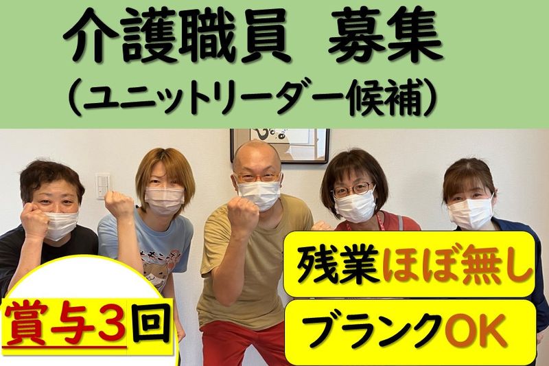【アピールポイント】 グループホームにて介護職員(ユニットリーダー候補)を募集します! ■ブランクOK ■賞与年3回 ■学歴不問 ■残業ほぼなし