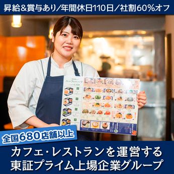 【保険制度】 雇用保険、労災保険、健康保険、厚生年金 待遇・福利厚生 【福利厚生】 ・昇給年1回 ・賞与年2回 ・交通費全額支給 ・社会保険完備 ・各種手当(役職等) ・退職金 ・社員持株会 ・社員割引(60%off) ・制服貸与 《運営会社について》 日本レストランシステム(株)では、 『星乃珈琲店』『洋麺屋五右衛門』など、 全国680店舗以上のカフェ・レストランを展開中!