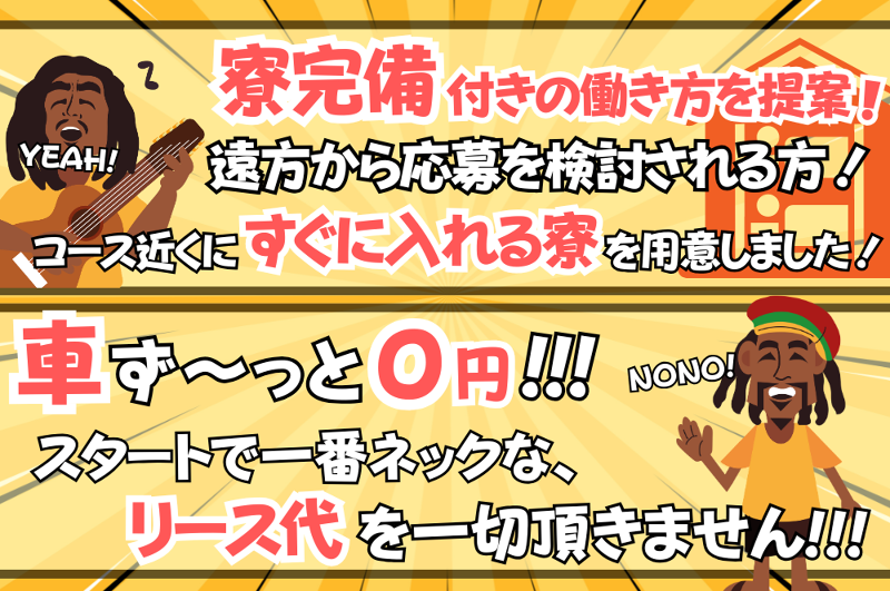 待遇・福利厚生: ・寮完備 ・車無料 ・メンテナンス費無料 ・ガソリンカード支給あり ・週払いOK ・初期費用無し ・履歴書なし ・ロイヤリティ無し