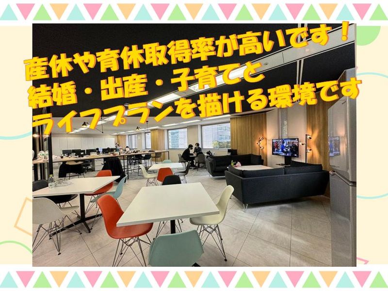 職場環境 ゆったり休める環境です♪キッチンカーで日替わりランチを楽しんだり一人でまったり社内でスマホいじって、 お弁当を食べてから、ソファーでスヤスヤ♪なんてこともOK!!気を使わずに過ごせる環境です◎お昼は交代制♪ 休憩中に急な電話や対応なども一切ございません! 喫煙所:喫煙所あり(屋外) 受動喫煙対策有:喫煙所有