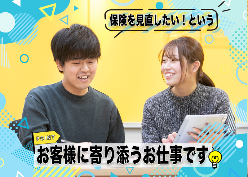 仕事内容 \\ ✨営業の常識が変わります✨ //  ̄ ̄V ̄ ̄ ̄ ̄ ̄ ̄ ̄ ̄ ̄ ̄ ̄ ̄ ̄ ̄ ⭐「探す」のではなく「話す」仕事 テレアポ・飛び込みなどの 新規開拓業務は一切ありません! 専任チームがアポイントを取得するため、 あなたは「商談」だけに集中できます。 ⭐未経験からプロを目指せる研修! 入社後はまずPRスタッフとして、 お客様と接することからスタート。 知識ゼロから段階を踏んで、 無理なく成長できる環境です。 資格取得も会社が全面バックアップ! ⭐頑張りは給与に直結! 固定給に加えて、 成果に応じた「報奨金」を支給。 入社3年目で年収600万円も可能。 「稼ぎたい」意欲に応える環境です。 ⭐Web面接OK 地元で腰を据えて働けます。 スピーディーな選考が可能! ┏━━━━━━━┓ ◆ お仕事内容 ◆ ┗━━━━━━━┛ 保険の見直しや加入を検討されている お客様へのコンサルティング営業です。 ✅:100%反響営業スタイル ━━━━━━━━━━━━━━ 既に保険に興味をお持ちのお客様への ご提案となるため、成約率は高め。 無理な勧誘のストレスはありません。 ✅:スケジュール管理もお任せ ━━━━━━━━━━━━━━ 商談の日程調整も専任スタッフが対応。 効率よくお客様先を訪問できるため、 無駄な待機時間も削減できます。 <入社後のステップ> ▼まずはイベント(PR)スタッフから 商業施設等でのイベントを通じ、 お客様との対話や保険の基礎を習得。 ▼資格取得&営業デビュー 働きながら保険募集人資格を取得。 先輩の同行を経て独り立ちします。 ※アポ取りは原則ありませんが、 研修期間中や空き時間に お願いする場合もございます。 ┏━━━━━━━━━━━━┓ キャリアパスが面白い! FA制度で希望の職種へ ┗━━━━━━━━━━━━┛ 一定期間経験を積んだ後は、 社内公募・自己申告で ・語学、住宅系など別業種 ・運営サポート ・人事、広報、企画職 などへキャリアチェンジが可能! 「まずは営業で基礎を作ってから、 本当にやりたいことを見つける」 そんな働き方が叶う会社です。 ✅:職場環境について ━━━━━━━━━━━ 20代~30代の若手メンバーを中心に 男女問わず活躍している職場です! ✅:チームワーク重視 ━━━━━━━━━━ 個人のノルマを追うだけの 孤独な営業スタイルではありません。 アポ獲得チームや先輩社員と連携し、 チームで目標を達成する風土です。 ✅:未経験でも安心 ━━━━━━━━━ 「知識ゼロ」が当たり前。 保険の仕組みや商品知識は、 入社後の座学とOJTで イチから丁寧にレクチャーします。 分からないことはすぐに聞ける、 風通しの良い環境です。
