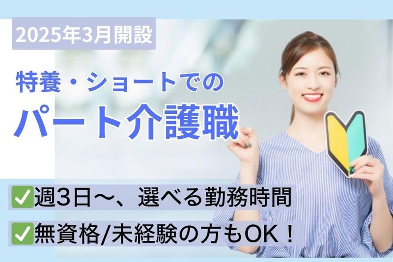 仕事内容 2025年3月オープンの介護施設! まだまだフレッシュな環境です。 一緒に良い職場を作りあげていきましょう! ✨おすすめポイント✨ ・週3日~OK! ※ご希望をお聞かせください ・無資格 / 未経験の方もOK! ・子育てと両立しながら勤務しやすい環境 ・女性スタッフ活躍中 ・昇給賞与あり ・正社員登用あり ※パートからスタート→正社員 という選択も可 - ✨仕事内容✨ 特別養護老人ホーム およびショートステイでの介護業務 ・入所者の日常生活の補助 ・入居者の排泄、入浴、食事、 移動、移乗他介助 ・入所者の状態把握 (体調不良者の様子確認) ・体調不良時の対応、他職種への情報提供 ・夜勤業務(排泄、巡回その他解除全般) ※希望者のみ - ✨施設長から皆さまへ✨ 皆さまが快適に働けるよう、 楽しく明るい施設にしていきたいと 思っています。 また、身体的に現存機能の低下を 塞げるように、リハビリにも 注力したいと思います。 一緒に良い施設を作ってくださる方、 お待ちしています。