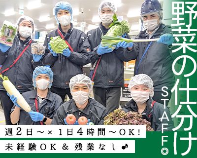 メッセージ 1日4時間~の時短勤務OK! 勤務は週2日~可能なので 柔軟な働き方ができます♪ 日曜・祝日勤務できる方は 時給60円UPなのでお小遣いを 稼ぎたい方にもオススメ! ◎おすすめポイント◎ ▼未経験者歓迎 ▼週2日OK ▼即日勤務OK ▼主婦(夫)歓迎 ▼フリーター歓迎 野菜の卸売