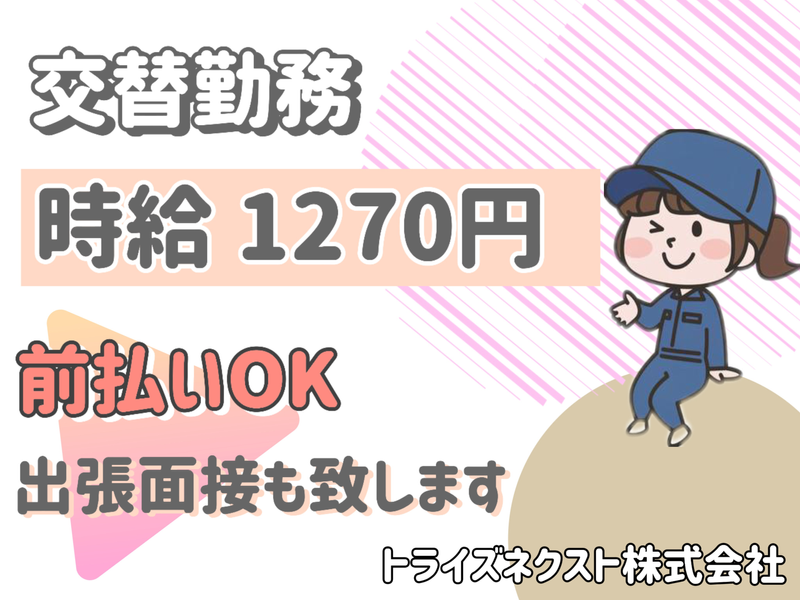 ■勤務時間 【勤務形態】 5勤2休(夜勤のみ) 18:30~03:15(休憩時間22:30~23:15) ※生産状況により19:45~4:30(休憩時間23:45~24:30) ※一日の定時は8時間です。 ■シフト 一か月 ※シフト・収入例 時給1270円 月収28万円以上可能(160H+残業手当+深夜手当) ※交通費は別途支給(1km辺り16円往復代) ■勤務曜日 月 火 水 木 金 ■労働時間 実働時間:実働8時間 平均勤務日数:週5日