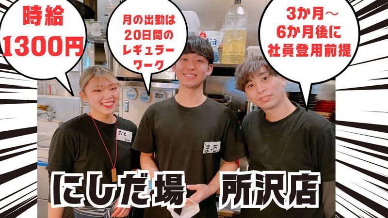 仕事内容 ✨――――――――――――――――✨ 正社員を目指したい方大歓迎 高時給1300円!未経験OK! ✨――――――――――――――――✨ ⭐人気居酒屋で新規スタッフ大募集⭐ いきなり正社員はちょっと不安…という方もご安心ください! まずはアルバイトとして、お店の雰囲気や仕事内容に慣れていただくことからスタートできます。 先輩スタッフが丁寧に指導しますので、未経験の方でも安心ですよ。 あなたの頑張り次第で、最短3ヶ月後には正社員へのステップアップ可能です。 キャリアアップを目指したい方は、ぜひこの機会にご応募ください。 主なお仕事内容は、 ✅仕込み ・調理 ・串打ち ・開店前清掃 など ✅ホール・キッチン全般 ・お客様のご案内 ・注文のお伺い ・かんたんなドリンク、調理 ・ドリンクや料理の提供 ・テーブルの片付け、セット ・お会計対応 など チェーン店のようなマニュアルはありません。 個性を活かせる職場です! ⭐にしだ場について⭐ 大きな提灯と紺色ののれんが目印! お店の周りには焼き鳥のいい匂いが漂い、お持ち帰りでご利用されるお客様も♪ 定番の「もも」や「つくね」などはもちろん、「やきとん」や「とろーりチーズ」などの変わり串、季節限定の串なども取り揃えています! 串物以外にも一品料理をご用意しています。 例:トロトロの牛すじ煮、各種サラダ、揚げ物、〆のお茶漬けなど。 さらに【季節のオススメメニュー】など、季節に応じた特別なメニューもありますよ♪ また、キンキンに冷えたグラスで美味しいお酒も提供! 各地から厳選した日本酒など、こだわりのドリンクメニューもご用意しています! ⭐店内について⭐ お座敷席があるため、大人数でのわいわいとした宴会だけでなく、お子様連れのご家族でも安心して過ごせるお店です。 ⭐イベント多数!⭐ ・夏のバーベキューやボウリング大会 ・冬の忘年会 ・3月の卒業式とアワード表彰式 など、イベント多数開催しています! アットホームな雰囲気で充実した生活を送れますよ!