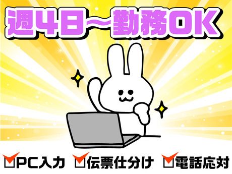 仕事内容 PC入力、伝票仕分け、電話応対 \\ 週4日~勤務OK!// PC入力や伝票仕分けを中心とした お仕事をお任せします♪ PCスキルや事務の経験を 活かしたい方にもおすすめです★ (具体的には)  ̄ ̄ ̄ ̄ ̄ ̄ ■PCを使用した入力 ■伝票の仕分け ■電話応対(取り次ぎメイン) など わからないことは先輩staffが 丁寧にサポートするのでご安心下さいね♪ ★☆ 短期・長期歓迎 ☆★ ●働き方は自由自在! ●スキマ時間や空いている日を有効活用できる! ●長期で稼げる◎レギュラーワーク! ━━━━━━━ ★こんな方に★ ━━━━━━━ ■長期休暇に自由にお金を使いたい! ■週末の飲み会に向けてお金が欲しい ■会話少なめで簡単な仕事が欲しい など ★☆嬉しいメリットを教えてください!☆★ 【1】日払いOK 「急な出費のときに本当に助かる…」 「欲しいものがすぐに買えます♪」 「遊ぶ予定の前にサクッと稼いでます!」 【2】短期OK 「長期休みのときだけ働いてます!」 「次の仕事が決まるまでの"繋ぎ"で」 「季節限定のオシゴトだけ♪」 ★☆ スタッフの声 ☆★ 「家庭と両立して働けています。 子育てが落ち着いたらもう少し シフトを増やしてみようかな!」 「アルバイトをしていたけど 急にシフトに入れなくなって 困っていたときに応募しました!」 みなさん、学校・家庭・他のお仕事など と上手に両立しながら働いていますよ♪