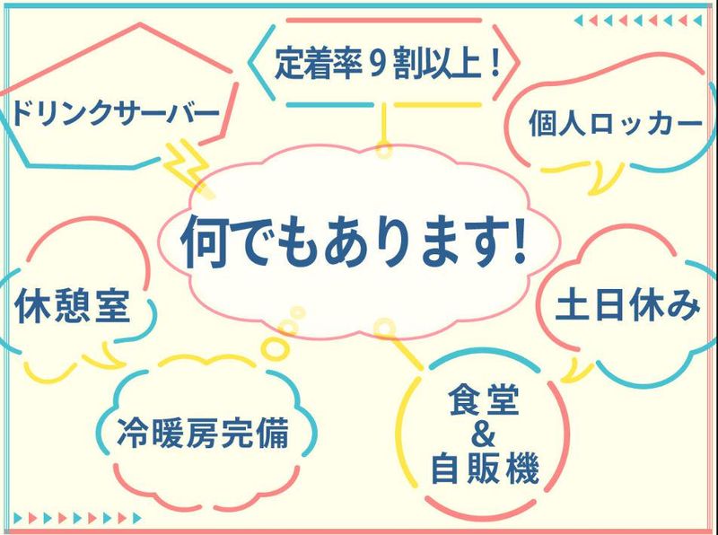 求めている人材 20代~50代の主婦さん活躍中! 現在、約70名の方が活躍中! 小学生や中学生の子どもがいるママさんをはじめ、 子育てを頑張りながら働いてくださる方がたくさんいらっしゃいます。 ❖在職中のパートさんに聞いた働きやすい理由トップ3❖ ✨1位・・・お休みがちゃんと取れる!(休みやすい雰囲気!) ✨2位・・・働く仲間(同年代の仲間も多くて働きやすい) ✨3位・・・キレイな職場(空調完備の広々スペース!キレイな食堂があるのも!) お仕事も短時間で覚える必要はありません。少しずつで良いので覚えていってくださいね。 子育てと両立して働きたい全てのママさんを応援してます! ✨N1以上必須(日本語能力) ※日本語でのコミュニケーションに支障のない方 \こんな方にもオススメ/ 軽作業未経験の方 ブランク復帰できる仕事を探している方 セカンドキャリアとしてのお仕事をお探しの方 パート・アルバイトのお仕事をお探しの方 10代・20代・30代・40代・50代から中高年まで活躍している職場を探している方 \こんなお仕事を探されている方にピッタリ/ 商品検品・仕分け・ピッキングなどの倉庫内作業 箱詰め・ラベル貼り・シール貼りなどのコツコツもくもく軽作業 梱包・包装・組立・加工などの工場製造 検査・充填・品出しなどの機械オペレータ 食品工場(肉・鮮魚・野菜・惣菜)での盛り付け・調理・材料カット カンタン作業・ライン作業 プラスチック加工や部品組み立て、商品検品・仕分けなどの経験がある方