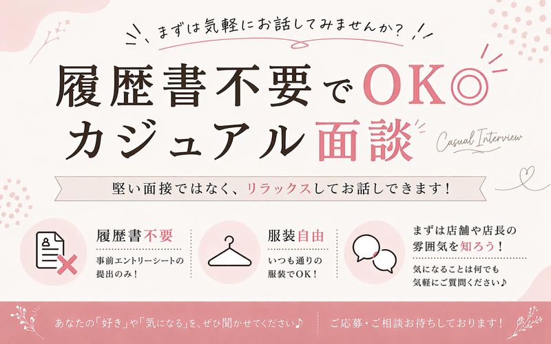 選考プロセス \スピード採用実施中/ 在職中の方は入社日もご相談ください◎ ✅STEP1|応募 ・WEB応募(24時間受付) ・LINE応募もOK( LINE ID:「@808tpfzc」) 応募後、1~2営業日以内にご連絡します。 ✅STEP2|カジュアル面談(1回のみ) ・応募店舗にておこないます ・私服参加でOK >> 履歴書は不要です << 面接日が決まり次第、 簡単なエントリーフォームをお送りします。 入力するだけでOK◎ >>顔写真も自撮りでOKです << 事前準備はほとんどありません。 ✅STEP3|内定 合否はスピーディーにご連絡します。 ※正式な履歴書は【採用後】にご提出いただきます。 ※面接日当日のご連絡(変更/キャンセル/場所がわからないなど)は 必ず店舗へ直接お電話をお願いいたします。 (採用窓口は確認が遅れる場合がございます) 【GW期間中のご案内】 期間中は、ご連絡までにお時間をいただく場合がございます。 お急ぎの場合は、直接店舗までお問い合わせください。