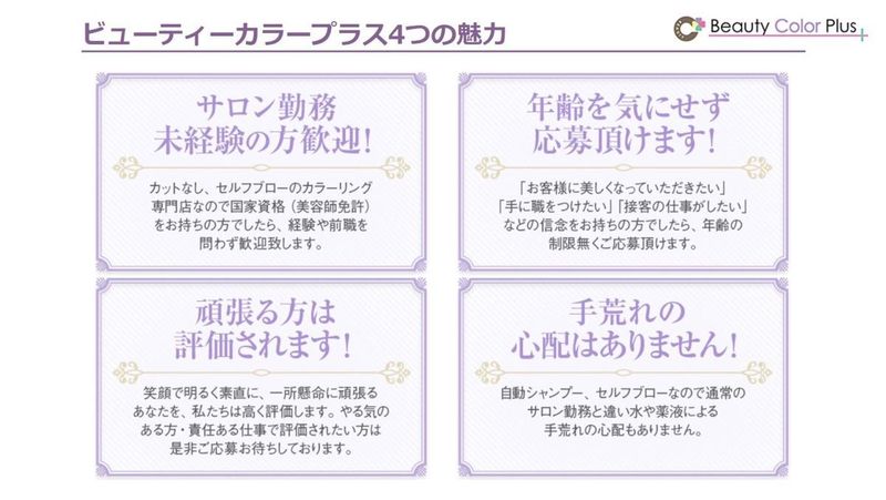 仕事内容 ヘアカラー専門店での接客対応です。 ヘアカットは一切行いません! カラー見本から希望の色を選んでいただき それに合わせ機械で薬剤を自動調整するので 必要な専門知識も少なくすみます。 対応客数・販売数等のノルマは無し! 「薬剤の塗り方」「お客様との会話」など 全てマニュアルが完備されているので ブランクから復帰をお考えの方も安心です。 #カラー剤は機械が自動で調合 #オートシャンプー&手袋OKで手荒れ予防 #券売機使用でレジ業務ナシ #ブローもお客様によるセルフブロー #週2日~・短時間勤務OK! *土日祝日は時給100円UP! ー <仕事の流れ> お客様が券売機でチケットを購入 | カラー見本を元にお色の希望をお伺い 注文されたカラーを機械で調合 | カラー材を塗布 *爪の変色や手荒れ予防の手袋着用OK | オートシャンプー台で洗い流し *襟足・顔周りは手洗いで対応 | セルフブロードレッサーにご案内 <教育・研修体制> 未経験やブランクのある方でも接客・技術研修があるので、安心して入客できます。 店舗配属後も、ベテランパートナーがしっかりサポートします。 ・入社後の流れ 初日はPC作業や登録からスタート。 2〜3日目はシャンプー練習、 その後カラー業務へと順を追って学び、 無理なく現場デビューができます! 先輩スタッフが横について指導するため、 ブランクのある方も安心です。 <こんなスタッフが活躍しています> 「結婚・子育てで美容の仕事から離れていたけれど、もう一度美容師免許を活かして働きたい」「サロン勤務は無理だけど、家事・子育ての空き時間を利用して働きたい」など、 目的や理由は違うけれど「美容や接客が大好き!」という人が活躍しています。 <先輩の声を紹介!> 元スタイリストの主婦パートさんが多数活躍中! 【スタッフAさん】 結婚を機に美容室を辞めましたが、育児もひと段落し、子どもの教育費のため復職しました。ヘアカットがなく、薬剤の調合も機械で全自動なのですぐに慣れることができました! 【スタッフBさん】 美容師免許を活かしたくて、ブランクに不安を感じつつ入社しました。カットなし&セルフブローのカラーリング専門店なので無理なくお仕事に復帰できています。一番嬉しいのは、子育てとの両立がしやすいことですね。ライフスタイルに合わせた働き方ができるので、プライベートも大切にできています。