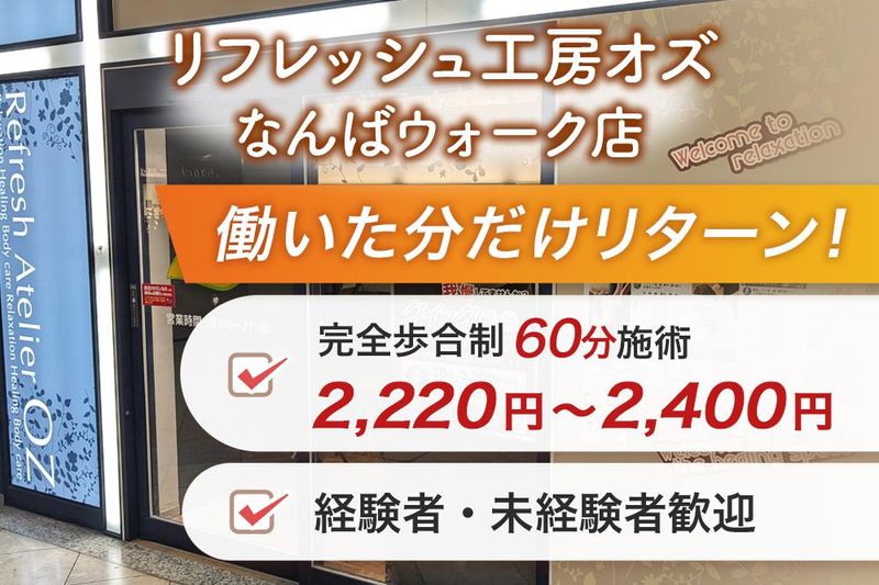 仕事内容 ─────[おすすめポイント]────── ★選べる働き方!日数・曜日相談OK! ★経験者技術チェック後、即日勤務可能! ★登録料2,000円/1店舗で系列店Bフィット ネス使い放題! ──────────────────── ◆身もココロも癒される都会のオアシス  ̄ ̄ ̄ ̄ ̄ ̄ ̄ ̄ ̄ ̄ ̄ ̄ ̄ ̄ ̄ ̄ ̄ ̄ ̄ リラクゼーションサロン『オズ』では セラピストのスタッフを募集しております 専門の技術を用い お客様に心のこもった癒しを提供する、 とてもやりがいのあるお仕事です そんな「オズ」で一緒に働きませんか? 完全歩合制◆働いた分だけリターン!  ̄ ̄ ̄ ̄ ̄ ̄ ̄ ̄ ̄ ̄ ̄ ̄ ̄ ̄ ̄ ̄ 60分施術 2,220円~2,400円 技術と頑張り次第で収⼊UP あなたの技術と心遣いがそのまま お客様の満足と収入につながります ******* ▼ 仕事内容 ▼ ******* あなたの技術でお客様に 安らぎと最高のひと時をご提供してください <施術メニュー例> ・もみほぐし ・リフレクソロジー(足つぼ) ・リンパドレナージュ シフト制なので予定も立てやすく Wワークや副業の方にも働きやすい環境♪ ────────────── 専用の技術スクールあり ────────────── ~無料で丁寧な技術指導が受けられる~ ▶技術の不安を解消! ・一度に全部を覚える必要はなく できる内容から順番に身につけられるので 最初はできなくても講師と一緒に乗り越え られます ▶デビューの不安を解消! ・接客を想定した練習を繰り返すので 不安なままデビューする事はありません ー ※講習期間:1日~30日前後
