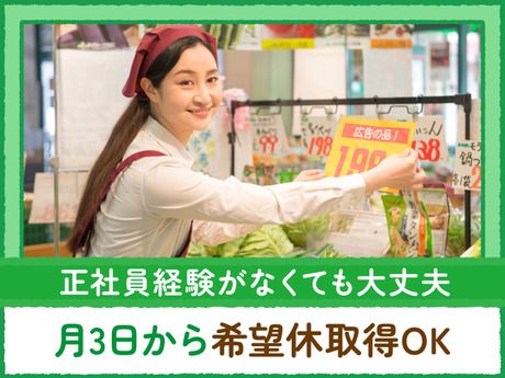 仕事内容 仕事内容 商品の仕入れから加工や陳列、販売、数値管理などをお願いしま す。配属先は農産部、水産部、畜産部、デリカ部のいずれかとな るため、配属先によって扱う商品が異なりますが、いずれの部門 でも先輩が丁寧にサポートするのでご安心ください。スーパーで の勤務経験がないという方からの応募も大歓迎です。 【経験不問の正社員募集】 経験者だけでなく、未経験から正社員にチャレンジしてみたいという方の応募も歓迎しています!先輩社員のサポート体制が整っている職場のため、できることから少しずつ。ステップアップ感覚で業務を覚えていける職場です。アオキスーパーの正社員として働いてみたい方、まずはお気軽にご応募ください。 【地元愛を力に!安心のキャリアを】 慣れ親しんだ地元で、腰を据えて長く活躍しませんか?アオキスーパーは転居を伴う異動がないため、地域に根ざして働くことが可能です。また、平均勤続年数は15.3年と長く、働きやすさの証です。育児休業の取得にも力を入れており、2024年の取得率は男性83.3%、女性100%!ライフスタイルが変わっても安心して働ける環境で、キャリアを築きませんか。 【あなたを応援!アオキの独自制度】 アオキスーパーでは、社員一人ひとりが輝けるよう、うれしい福利厚生を多数ご用意しています。髪型・髪色が自由、アクセサリー類の装着もOK(一部部門除く)なので、おしゃれも楽しみながらあなたらしく働けます。さらに、奨学金返還支援(代理返還)制度や、低用量ピル服用費の全額補助、禁煙サポートプログラムの全額補助など、社員の生活と健康を多角的にサポートする制度が充実しています。 【待遇UP!頑張りをしっかり還元】 社員の頑張りに応えるため、アオキスーパーは待遇改善も積極的に行っています。キャリアの明確化、処遇の明確化を実施し、さらなる働きがい向上を目指しています。また、固定残業代はなく、時間外手当は別途きちんと支給。お正月など特定日の勤務には手当を支給するなど、従業員の満足も大切にしている職場です。