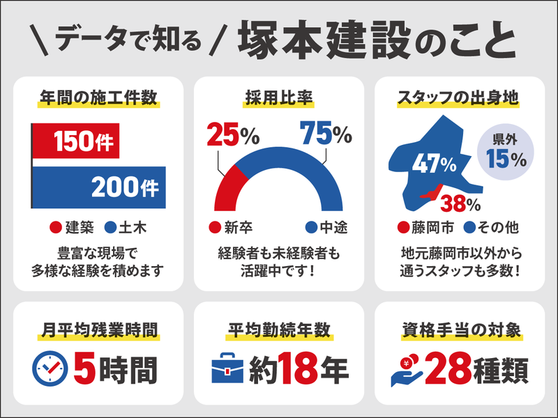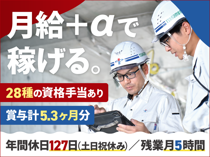 仕事内容 \資格を活かして、より働きやすい環境へ/ 「家族との時間も大切にしたい」 「もっと大きな現場で成長したい」 そんな想いを叶えられる職場です。 〇賞与5.3ヶ月分/住宅手当・特別休暇あり 〇土日祝休み × 年休127日 × 残業月平均5h 〇県外出張ほぼなし!群馬県内メインの現場 施工管理としての知識を活かしながら、 チームで支え合い、後輩育成にも関われる。 当社で“働きやすさ”と“やりがい”の両方を 手に入れませんか? -------------------- 【仕事内容】 工程管理/安全管理/品質管理/原価管理 [現場]群馬県内 [工事]橋梁工事・トンネル工事・ 道路工事擁壁工事・砂防工事・河川工事 ※現場は群馬県内。県外出張ほぼなし! 【 転職組に聞いた!当社の魅力はココ! 】 01:大規模工事に携われる「やりがい」  ̄ ̄ ̄ ̄ ̄ ̄ ̄ ̄ ̄ ̄ ̄ ̄ ̄ ̄ ̄ ̄ ̄ ̄ 「会社で携わっている工事を見かける 機会も多く、”あれがパパの会社の仕事だよ” と子供に自慢しちゃってます(笑)」 02:複数人担当制で安心感&効率UP  ̄ ̄ ̄ ̄ ̄ ̄ ̄ ̄ ̄ ̄ ̄ ̄ ̄ ̄ ̄ ̄ ̄ ̄ 「前職は1人で管理していたので、 チームで悩みを解消できるのが大きい。」 「自分にないアイデアを取り入れられる!」 「施工管理だけじゃなく作業員の方からも たくさんアドバイスを貰えるのが助かる!」 03:後輩教育など多方面で成長できる!  ̄ ̄ ̄ ̄ ̄ ̄ ̄ ̄ ̄ ̄ ̄ ̄ ̄ ̄ ̄ ̄ ̄ ̄ ̄ 「会社全体でイチから育てる雰囲気があり、 教えることから得られる刺激があった!」 -------------------- より働きやすく ~働き方改革の一部を紹介~ -------------------- *完全土日祝休み *年間休日127日 *デジタル技術導入による残業月平均5h *現場で頑張る社員のために、 ほっと一息つけるコーヒーマシンの設置 *2026年4月には基本給もアップ予定 ずっと気持ちよく働ける職場を目指して、 働きやすさの整備に力を入れています! 「もっとこうなったらいいな」という希望や ちょっとしたモヤモヤも見逃さずに、 より働きやすい環境を目指します。 【会社概要】 *建設業評価Aクラス (昨年度土木部門県内5位) *年間施工(建築:150件 土木:200件) *社員114人 *平均勤続年数18年 施工実績多数!気になった方はHPへ >>https://tsukamotokensetsu.co.jp/ スペシャルムービーも!採用サイトはこちら >>https://tsukamotokensetsu.co.jp/recruit/