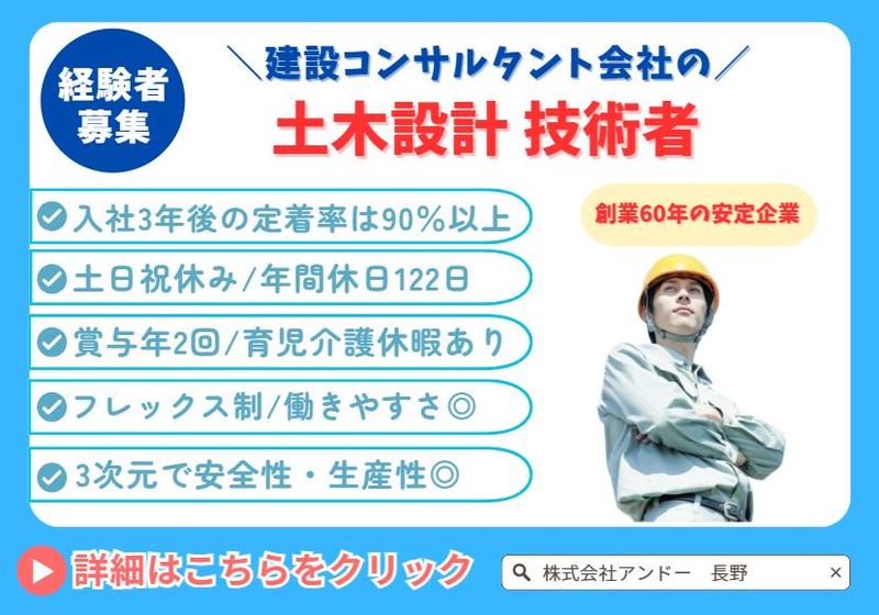 仕事内容 ………⭐おすすめPOINT⭐……… ✅完全週休2日制×土日祝休み ✅年間休日122日 ✅創業60年の安定企業! ✅最新3D・UAV測量を導入しています ✅土木設計の経験者募集◎ ✅建設コンサルタント業務に関する 資格をお持ちの方も大歓迎! └技術士・RCCM・測量士など ✅給与は年齢・経験・能力を考慮し相談◎ ✅入社3年後の定着率は90%以上✨ ✅賞与年2回/昇給あり/資格手当あり ✅通勤手当・家族手当・住宅手当あり ✅フレックスタイム制✨ └コアタイム:10~16時 ✅年間休日の他に年5日程度、 有給の計画的付与日あり ✅長期休暇・介護休暇・育児休暇あり ⭐仕事について ――――――――――― 技術部門の土木設計技術者として、 地域社会のインフラ整備の 企画・調査・測量・設計・監理などを お任せします。 ※地域社会インフラ └道路・河川・橋梁・砂防・ 上下水道・公園・都市計画など <具体的な仕事内容> ✅測量 ✅地質調査 ✅社会資本工事の設計 ✅官公庁との打合せ など ⭐お仕事のやりがい ――――――――――― 某公園、サッカー場など、 自分が作った企画が実際の形になり、 何十年も地図に残り続ける仕事であることが 非常にやりがいです。 ⭐入社後は… ――――――――――― 入社後数ヶ月間は 測量技術をはじめとする 基本的な実技を経験していただき、 理論を学んでいただいた上で、 設計業務をお任せします。 設計業務のレベルや規模は 簡単なものから複雑なものまで様々です。 スタッフのスキルに応じ、 段階的にお任せしていきますので ご安心ください。 ⭐チーム配属について ――――――――――― スタッフの経験・得意分野を踏まえ、 適切なチームへの配属となります。 各チームの技術者が専門分野を担っており、 分野を横断しながら 技術の共有・吸収を行っていますので、 不明点などがあれば部署を問わず 気軽に相談ができる 風通しの良い環境です。 ⭐3次元化の取り組みについて ――――――――――― 2012年にUAVを導入し、 2016年には国直轄事業の ICT施工における起工測量を実施するなど、 県内でも先駆けてUAV測量に 取り組んできました。 搭載している グリーンレーザースキャナにより、 濡れた地面や水中の測量にも 対応可能です。 2次元での図面作成や施工管理が 主流となっている土木業界ですが、 3次元での 測量→設計→施工→管理に移行する 過渡期となっています。 当社では業務成果へ 3次元測量や設計を取り入れており、 安全性・生産性を高め、 高い評価をいただいています。 ⭐当社について ――――――――――― ✨創業60年。 調査、計画、設計、維持管理を 総合的に担う総合建設コンサルとして、 各段階の業務に対応してまいりました。 ✨その他にも専門家として、 国・地方自治体・民間の事業者へ 技術的提案を行うなど、 パートナーとしての役割も 担っています。 ✨施工、補修、廃棄物リサイクルを担う グループ企業を有しており、 ワンストップでサービスのご提供が可能です。 ✨スタッフ一人一人に合った道で 存分に力を発揮していただくのが 当社のポリシーです。 その部門のプロとして ご活躍いただけるよう 充実の教育体制をご用意していますので、 「測量・調査に興味がある」 そんな方はぜひご応募ください。 ※東北信支店での勤務となりますが、 長野県内での転勤の可能性もございます。 └本社(長野県松本市)・飯田支店(同飯田市)
