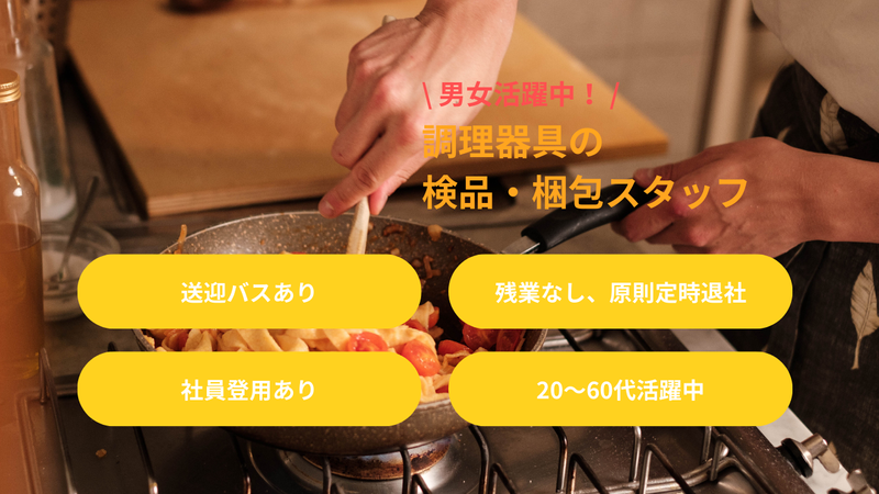 仕事内容 工場内での軽作業のお仕事/未経験OK/土日祝休み/男女共に活躍中の職場です。 工場内での調理器具などの梱包や検品等のお仕事になります。 軽作業ですので未経験でも数日程度あればすぐに覚えられます◎ 【おススメポイント】 ・難しい知識は必要なく、未経験でもスタートできます。男女共に活躍している職場です。 ・少人数の職場ですが、人間関係が良いと評判です(当社スタッフ談) ・送迎バス完備 詳しい職場情報については担当よりご案内いたします。 まずはお気軽にご応募・ご登録お待ちしております。