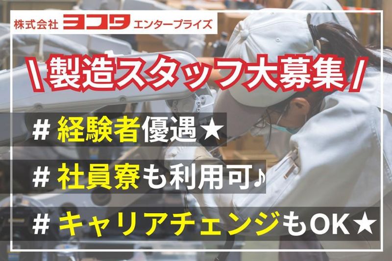 仕事内容 ✨求人の魅力 ✅プロとして成長を実感できる 製造現場で培った知見や マネジメントのスキルなどを活かし 製造現場をまとめるリーダーへ! 新しいステージで、安定して 長く働けるポジションがあります。 また当社独自の教育制度である 「ヨコタアカデミー」では、 リーダーシップを養う研修や、 資格取得のサポートなど、 社員一人ひとりの理想のキャリアの 実現をサポートする環境をご用意! 製造業界で次のステップへ挑む方を 私たちが応援します! ✅「昼食無料」など福利厚生充実 「社員の生活を支えたい」という 想いから、昼食を無料にしています。 約40種類のメニューの中から、 日替わりで4種類の定食をご提供! 季節のドリンクも飲み放題なので、 食費を節約できます。 他にも 「社員寮完備」 「交通費全額支給」 「引っ越し費用サポート」など 待遇・福利厚生を揃えています! ✨仕事内容 自動車パーツを製造するメーカー工場で リーダーとしてチームを支えるお仕事! ✅主な業務 ・メンバーの勤怠管理 ・メンバーの業務フォロー ・メンバー不在時の業務代行 ・工場長や工程長への日々の報告 など チームの中心的なポジションとして 現場を支える手応えを感じられます。 ✨安心の研修制度 入社後は丁寧なOJT研修を実施。 製造現場経験を活用できるよう サポートするのでご安心ください。 ✨ヨコタアカデミー制度 自分の価値を高め、 理想の人生やキャリアを歩めるよう 教養・スキルの習得を目指せる 当社独自のキャリア支援制度です! ✅将来のキャリア例 *IT・開発・設計・生産技術・建築など 様々な分野におけるエンジニア *大型トラックドライバー *本社内勤の現場管理者 *フォークリフト作業者・溶接作業者 ✅あなたの成長をバックアップ 将来どんなキャリアを実現したいか、 担当者とじっくり面談を行います。 目標を設定したらキャリアが 実現するまでバックアップします! 講師によるセミナー受講や Webでの座学を通じて、 キャリア形成に必要なスキルを習得可◎ 資格取得支援もあり、 活躍の幅を広げられます。