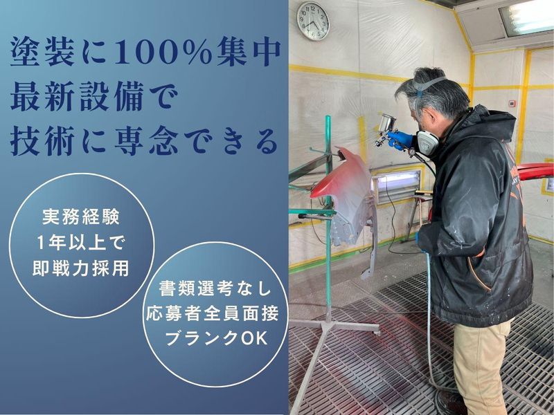 求めている人材 <必須条件> ・‥…━━━━━━━…‥・ ✅ 塗装の実務経験1年以上ある方 (調色・吹き付け・磨きなど、工程の一部でもOK) <歓迎条件> ・‥…━━━━━━━…‥・ ✅ ブランクがある方 ✅ 車が好き/技術を誇りにしたい方 ✨ 学歴・年齢・資格不問! 面接では「人柄・想い」を重視します。