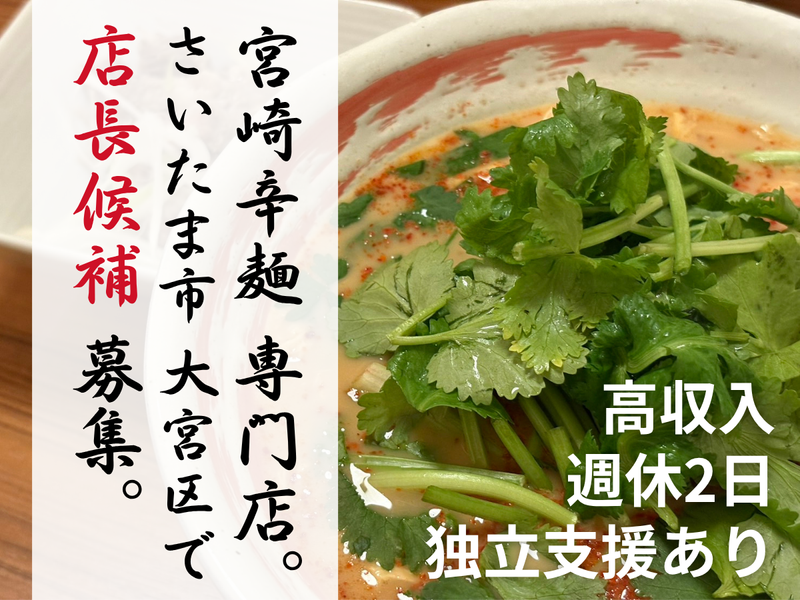 仕事内容 「自分の店を持ってみたい」 そんな想い、みやびで叶えませんか? 成功モデルのある業態だから、 ゼロからでも着実にステップアップ! ==================== 《宮崎辛麺みやび》って何? ==================== 宮崎辛麺みやびは、 “旨辛”で話題の「宮崎辛麺」の専門店。 にんにく×辛スープ×とき卵がクセになる 唯一無二の味と、SNS映えするメニューで 深夜でも行列ができる人気ぶり。 こんにゃく麺もありラーメンと比べても ヘルシーで女性のお客様も多いです。 すでにブランドが確立されており、 未経験からでも「売上が作れる仕組み」が整っています。 今回は、その店舗運営を担う、 正社員・店長候補の募集です。 最初は基礎からしっかりレクチャー。 接客・調理はもちろん、スタッフの育成や 売上管理など、将来的には独立可能な レベルまで、段階的に学べます。 ✅「キャリアアップしたい!」 ✅「新店の店長になりたい!」 ✅「将来自分のお店を持ちたい!」 ✅「マネジメントを学びたい!」 ✅「海外で働きたい!」 その夢、全部《みやび》で叶えませんか? 他の飲食店では経験できないことも、 うちなら経験できます! ▼主な業務内容 ● ホール接客(案内、配膳、レジなど) ● キッチン業務(盛り付け、仕込み、調理補助) ● アルバイトスタッフの教育・指導 ● シフト管理・労務管理 ● 食材の発注・在庫管理 ● 売上・原価の管理 ● 店舗改善の企画提案 など 店長、独立を目指す方には 仕入れや経営ノウハウも伝授します!