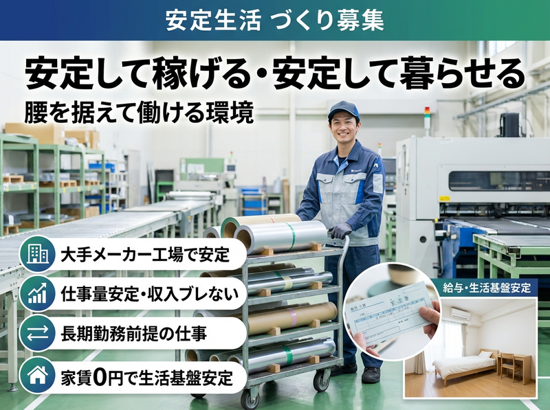 仕事内容 ⭐ 扱うのは、車の安全装置に使われる電子部品 加工後の製品はシート状なので、重たい部品や箱を持つ作業はありません。 ⏩具体的な作業内容 ・完成したシート状の製品をくるくると巻く ・巻いた製品を台車にのせて指定場所まで運搬 ・作業エリアの整理・簡単な確認作業 など ✨ 持ち上げる作業はほぼナシ ✨ 工程はシンプルで覚えやすい ✨ モクモクと進められる作業です ⭐未経験でも安心できる理由 ✅ 作業マニュアルあり ✅ 入社後2〜3週間の研修期間あり ✅ 分からないことはすぐ聞ける環境 「工場勤務が初めて」 「久しぶりの仕事復帰」 そんな方も、無理なくスタートしています。 ✨こんな働き方が叶います ・体への負担が少ない仕事を探している ・複雑な作業は避けたい ・安定した環境で長く働きたい “きつそう”なイメージとは違う 続けやすさ重視の軽作業です。