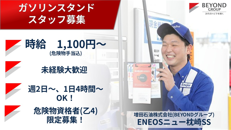■求める人物像・資格 【応募資格】 ・普通自動車免許(AT限定可)必須 ※車移動などのため ・危険物乙種四類免状をお持ちの方 【こんな方は歓迎します】 ・未経験者歓迎、初心者OK ・車好きの方活躍中! ・主婦(夫)さん、フリーターさん歓迎 ・ブランクがある方も歓迎 ・コンビニやスーパーでの接客販売経験も活かせます! ・交通誘導警備員、駐車場管理、レンタカーの求人をお探しの方にもおすすめ 【こんな方が活躍中】 ・20代、30代、40代、50代と幅広く活躍中! ・中高年・ミドル・シニア活躍中