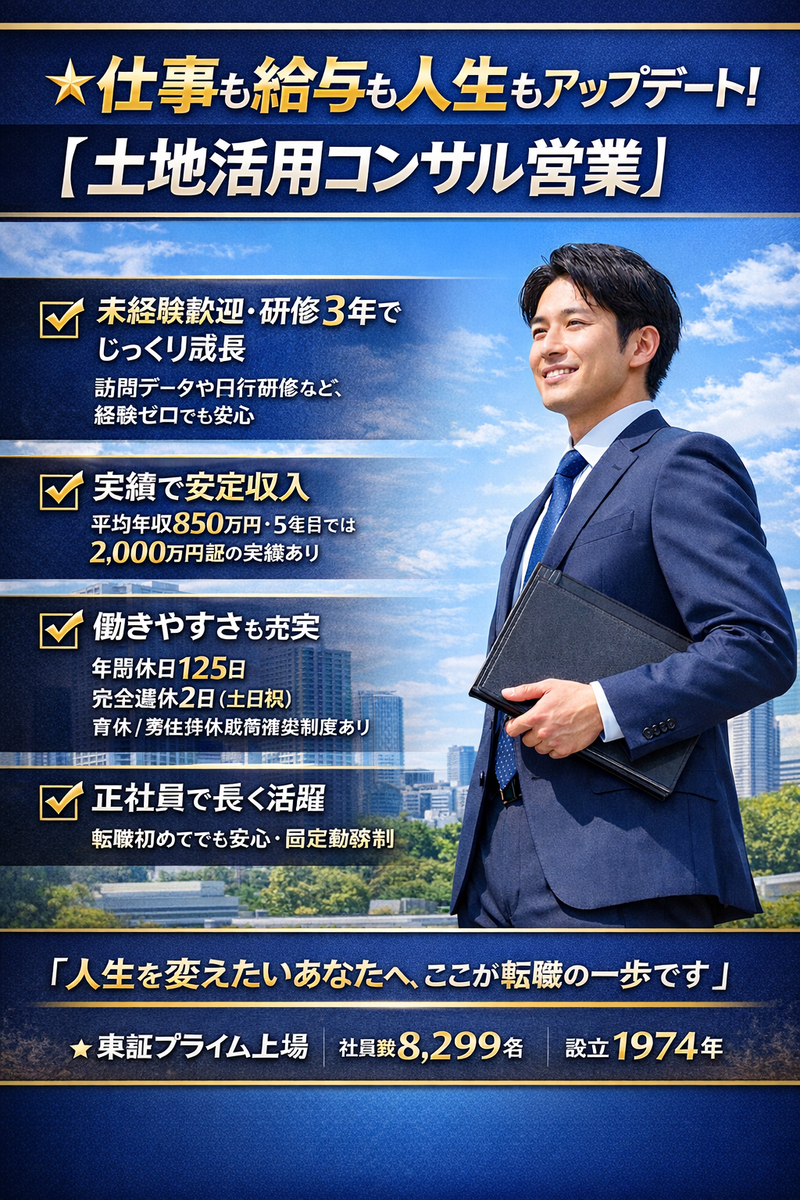 仕事内容 ■ 仕事内容 土地オーナー様へ アパート・マンション経営をご提案する 資産活用コンサルティング営業です。 ✔ 担当エリア制 ✔ 訪問先データは会社が用意 ✔ 契約時は上司が必ず同行 ✔ 3年間の研修制度あり 未経験からでも安心してスタートできます。 ■ この仕事の魅力 ★ 平均年収850万円 ★ 1契約あたり歩合135万~225万円 ★ 入社2~3年目で年収700~800万円多数 ★ 5年目年収2000万円超実績あり 努力が収入に直結する環境です。