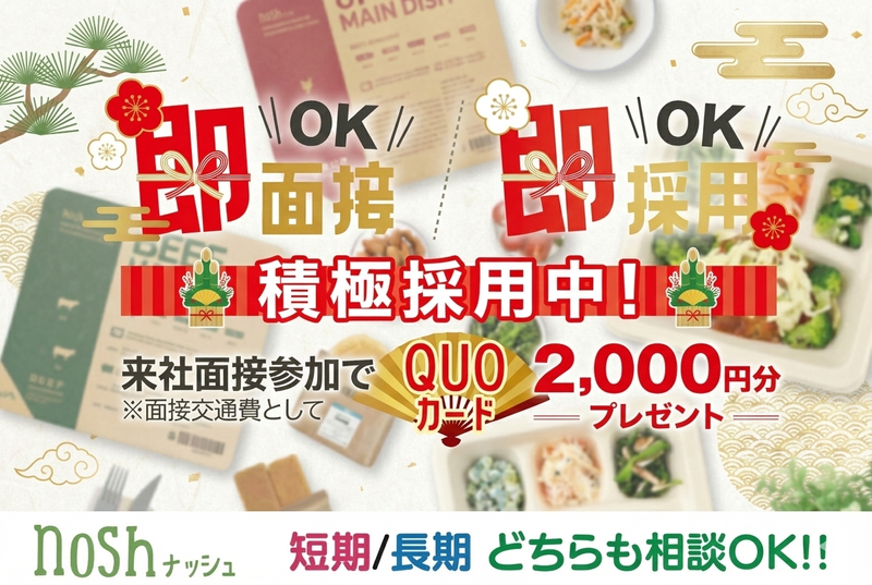 【保険制度】 雇用保険、労災保険、健康保険、厚生年金 待遇・福利厚生 【福利厚生】 ────────────── ▼ 給与・手当関連 ────────────── ◆日払い・週払いOK(規定あり) ◆皆勤手当あり ・月15,000円(皆勤) ・月5,000円(1回まで欠勤OK) ◆時間外手当あり ────────────── ▼ 通勤手段いろいろ♪ ────────────── ◆交通費支給(1日500円まで) ◆西九条駅から無料送迎バスあり ◆自転車・バイク通勤OK ◆無料の駐車場も完備 ────────────── ▼ 働きやすい環境づくり ────────────── ◆社会保険完備(加入条件あり) ◆有給休暇あり(簡単申請制) ◆正社員登用制度あり(最短3ヶ月) ◆制服貸与/通勤は私服でOK ◆髪型・髪色・ヒゲ自由♪ ────────────── ▼ 快適な休憩スペースも◎ ────────────── ◆冷蔵庫/電子レンジ/ポット ◆ウォーターサーバー/自販機あり ◆広々休憩室でリフレッシュOK ────────────── ▼ nosh社員割&イベントも♪ ────────────── ◆noshのお弁当を200円で購入OK! ◆社員イベントあり(自由参加) ・BBQや餅つき大会など開催 ・費用はすべて会社が負担します♪