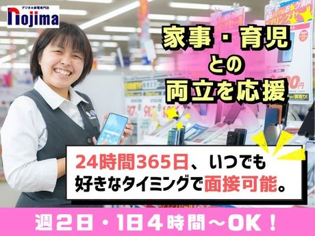仕事内容 ノジマのお仕事とは!? 【まずは短期からで大丈夫!】 「接客なんて学生のバイトぶりで不安…」 「私にできるか分からない…」 そんな主婦さんも安心してください。 ノジマでは“短期からお試し”が可能! やってみて「続けられそう」と思ったら長期へ切り替えられます。 久しぶりの社会復帰に →「最初はお試しのつもりが、気づけば10年以上います(笑)」 接客未経験でも安心 →「最初は商品陳列やカタログ整理などからスタート。徐々に慣れて自然と接客もできるように」 家庭優先で働ける →「子どもの行事や急な体調不良にも理解がある職場だから安心」 不安なまま飛び込む必要はありません。 “やってみてから考える”で大丈夫なんです。 - 【こんなお仕事です】 最初は ・カタログやチラシを並べる ・商品や小物をキレイに陳列する ・レジ対応や簡単なご案内 など、身近で覚えやすい作業からスタート! そして、慣れてきたら少しずつ、機種変更やプランのご提案にも挑戦。 最新スマホの知識が自然と身につくので、生活にも役立ちますよ♪ 主婦さんやブランクのある方も多数活躍中! 「まずはできることから始めて、ステップアップできる」そんなお仕事です。 ※販売ノルマはありません。 - 【ライフスタイルに合わせてシフト調整!】 ・子育ての合間に短時間勤務 ・平日メインで無理なく ・家事や家庭と両立しながら週2~4日 「子どもの発熱で急に休みたい」 「学校行事だからこの日は休みたい」 そんな調整ももちろん可能◎ 長期で続けるほどしっかり評価され、時給アップも目指せます! - 【成長できる環境】 ・接客に自信がなくても大丈夫! ・最初は簡単な仕事から少しずつステップアップ ・お客様からの「ありがとう」でやりがいを実感 「久しぶりの仕事復帰で不安だったけど、気づけば接客が楽しくなっていた」 そんな主婦スタッフもたくさんいます。 - 【365日24時間対応の録画面接可能!】 自宅からスマホで、私服のまま気軽に面接OK! 「子どもを預けられない」「家を空けられない」 そんな方にも大好評です。 「不安だから短期から始めてみる」 それがノジマならできるんです。 無理なくスタートして、安心して長く続けられる環境で働きませんか?