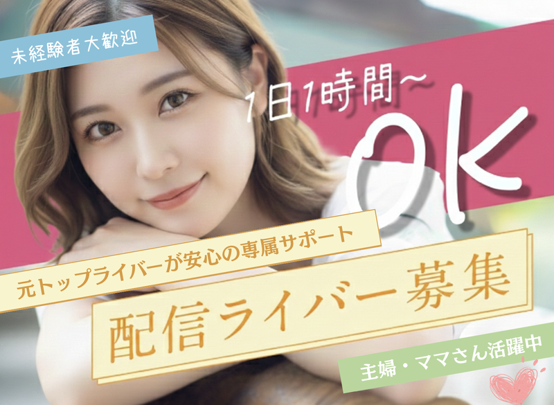 仕事内容 完全在宅 × スマホ1台でOK 未経験から始めるライブ配信(ライバー)募集です 【どんなお仕事?】 ライブ配信アプリで配信を行い、視聴者と会話(コメント返信)をしながら場を盛り上げるお仕事です。 配信内容は「雑談・趣味トーク・歌・日常の話」など、あなたの得意なスタイルでOKです。 【具体的にやること】 ・アプリ上でライブ配信(在宅で実施) ・視聴者コメントへの返信、コミュニケーション 【未経験でも安心のサポート】 「何を話せばいい?」「続けられるか不安…」という方が多いので、最初はここから一緒にやります。 ・初期設定/配信の始め方を手順で案内 ・“話題に困らない”トーク例・企画例を共有 ・あなたの生活リズムに合わせて、無理のない配信ペースを提案 ・困った時はすぐ相談OK(継続前提で伴走) 【働き方】 ・完全在宅(全国どこでもOK) ・配信時間は自由(家事育児・学業・本業と両立OK) ・短時間からでもスタート可能 ※登録料・所属料・レッスン料など、自己負担はありません。