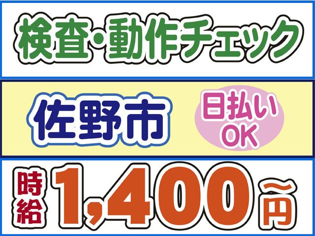 仕事内容 栃木県佐野市にある工場でのかんたんな軽作業 寮完備で遠方の方からのご応募も お待ちしております◎ 【検査スタッフのポイント】 〇未経験OK 〇日勤のみ 〇うれしい土日祝休み 〇20代30代40代の男性活躍中 〇高時給1400円 〇履歴書不要 〇日払いOK(規定内) 〇交通費規定支給(規定内) 【検査スタッフの仕事内容】 栃木県佐野市にある工場でのお仕事 車部品の塗装に関しての ・検査 ・動作チェック をお任せします 職場見学(30分~1時間程度)を実施しております。 【検査スタッフの勤務について】 〇土日祝休みの週休2日制 〇日勤・8:20~17:00 (実働7時間45分) 急な発熱・体調不良・冠婚葬祭など、 突発的なお休みに柔軟に対応しております。 【こんな経験活かせます!】 下記経験者は前職活かせます。 〇製造工場勤務経験 〇検査パート・アルバイト 〇軽作業パート・アルバイト 〇工場内派遣 〇主婦パート(職種不問) 前職不問で採用しております。 ブランクOK、経験の浅い方もOK コーディネーター・定着支援のWサポート体制導入 「マイリク定着支援」導入企業! アンケートで職場の様子を確認し、 コーディネーター・定着支援担当が連携してサポート。 はじめての派遣でも安心して働けるよう迅速かつ 丁寧にサポート対応いたします。 〇ご不明な点はお気軽にお問い合わせください お電話でのご応募、ご質問も受付中 株式会社ロフティー 太田支店 TEL0800-222-6888(フリーダイヤル) ↓お仕事情報など採用ページはこちらから https://entori.jp/loftyota
