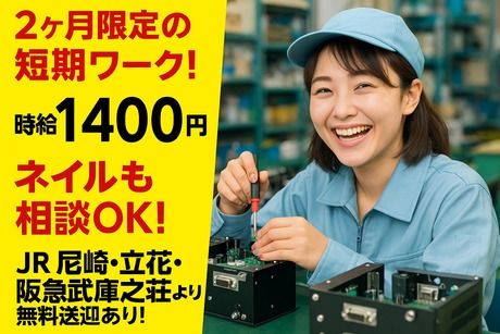 仕事内容 【お仕事内容】 \20~50代の男女活躍中!今すぐスタートできる方大歓迎!/ 電子機器の組立作業をお願いします。 ・部品の挿入 ・ドライバーでのビス締め ・リード線のカット など どれもシンプルで覚えやすい作業ばかり! *立ち仕事になります。 *冷暖房完備の快適な職場環境♪ *コツコツ作業が得意な方にピッタリ! 【ここがポイント!】 ●2ヶ月限定の短期ワーク! → 期間を決めて集中して稼ぎたい方に◎ ●時給1400円でしっかり収入♪ ●平日のみ&日勤で無理なく続けられる♪ ●JR尼崎・立花・阪急武庫之荘から送迎バスあり! ●ネイル相談OKの職場です♪ <交通アクセス> 【勤務地】 兵庫県尼崎市大浜町 ★各駅より送迎バスあり 「JR尼崎」「JR立花」「阪急武庫之荘」 ★車・バイク・自転車通勤可(無料駐車場完備) 【お気軽にご応募ください!】 ●お仕事や職場環境について気になることがございましたら、 お気軽にお問い合わせください! ●「自分でもできるかな?」と不安な方もお気軽にご応募ください! 未経験の方でも安心して始められるよう、しっかりとサポートします。 ●「毎月これくらい稼ぎたい」などのご希望もご相談ください! ●面接日・勤務開始日はお気軽にご相談ください!
