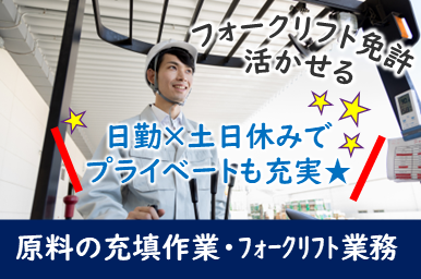仕事内容 【急募!!】フォークリフト経験者大歓迎!20~30代男性活躍中!日勤のみ!土日休みなのでプライベートも充実★マイカー通勤OK!無料駐車場完備! <仕事内容> フォークリフト業務(カウンター・リーチ) 原料の充填・充填機オペレーター 出荷準備や荷下ろし作業 伝票の整理や簡単なデータ入力がございます。 立ち作業でのお仕事です。 《環境》 ロッカー有り|休憩室完備 アピールポイント <仕事内容> フォークリフト業務(カウンター・リーチ) 原料の充填・充填機オペレーター 出荷準備や荷下ろし作業 伝票の整理や簡単なデータ入力がございます。 立ち作業でのお仕事です。 《環境》 ロッカー有り|休憩室完備 \充実した福利厚生/ ◎社会保険・雇用保険完備 ◎有給休暇有(6ヶ月経過後、10日付与)※規定あり ◎残業手当 ◎交通費支給(規定内) ◎確定拠出年金制度 ◎週払い制度(週3回対応) ◎お友達推薦制度あり(規定有り) ※1名につき3万円~10万円臨時給与として支給 ◎車(マイカー)通勤可(無料駐車場あり) ◎食事持参OK ◎制服貸与 ◎ロッカー・休憩室利用可 ◎福利厚生プログラム (宿泊、グルメ、ショッピングなど大幅割引が受けられる10万アイテムのメニューがあります。)