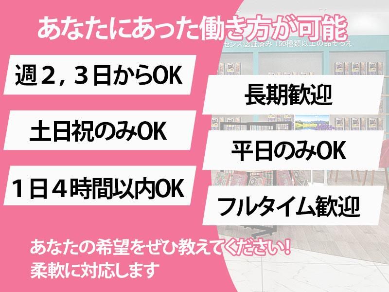 仕事内容 \この求人のおすすめポイント!/ ━━━━━━━━━━━━━━━━━━━━ ✅週2日・1日4h~OK!家庭優先でシフトが組めます ✅「夕方まで」「扶養内」など時間の融通利きます ✅久しぶりのパート復帰も歓迎!ブランクOK ✅買い物に便利なイオンモール内!車通勤もOK ✅難しい知識は不要!キットの販売がメインです ━━━━━━━━━━━━━━━━━━━━ 【業務内容】 イオンモール内の専門店「手芸時間」にて、 ビーズアートや手芸用品の販売をお任せします。 完成品の展示やキットの販売が中心なので、専門的な技術は必要ありません。 ▼ 具体的なお仕事 ▼ ・レジでのお会計対応 ・商品の品出し、陳列、整理整頓 ・「これ可愛いですね」といったお客様との会話 ・店内の清掃 ・簡単なディスプレイの変更 <未経験の方も大歓迎!> 1.「手芸は好きだけど詳しくない」で大丈夫!知識は入社後でOK。 2.販売ノルマは一切なし!お客様に寄り添うことを大切にしています。 3.同世代の主婦スタッフも活躍中。困った時はお互い様で助け合えます。 <<他にはない、ここで働く魅力>> 1.今年オープンの新店舗!綺麗で快適な環境で働けます。 2.「子供が急に熱を出して…」そんな時も柔軟に対応します。 3.可愛い商品に囲まれて、仕事中も穏やかな気持ちで過ごせます。 4.お得な社割あり!働きながら趣味の時間も充実させられます。 手芸時間オフィシャルサイト https://www.syugeijikann.com/
