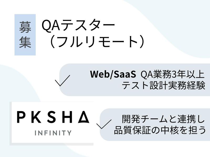 求めている人材 ✅《必須条件》 ・WebサービスやSaaSプロダクトでの QA業務経験(3年以上) ※ゲーム業界は除きます ・新機能仕様の理解に基づくテスト計画や テスト設計の実務経験 ・他の機能との関連性を踏まえた 仮説立てや多角的な視点でのテスト設計スキル ・挑戦を楽しみながら継続できる方 ┈┈┈┈┈┈┈┈┈┈┈┈┈┈┈┈┈┈ ✅《歓迎するご経験》 ・BtoB SaaSプロダクト (特に業務支援システム)でのQA経験 ・CI/CDパイプライン構築や テスト自動化組み込みの経験 ・リモート環境でのQAプロセス設計や運用経験 ┈┈┈┈┈┈┈┈┈┈┈┈┈┈┈┈┈┈ ✅《求める人物像》 ・業務に誠心誠意向き合い、 自分の役割を客観的に把握できる方 ・テキストでのコミュニケーションやマルチタスクが得意な方 ・根拠に基づいた論理的な検証や報告が可能な方