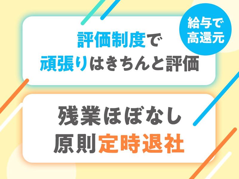 月給227,000円~427,000円 給与詳細 ※基本給・一律手当の総額 基本給:月給 21万7000円 〜 41万7000円 固定残業代:あり 【一律手当】 全員に一律で支払われる通勤・皆勤・家族手当金額:あり 1ヶ月あたり1万円 全員に一律で支払われるその他手当金額:なし ※固定残業代50,000円(47.5時間分)を含みます。 ※47.5時間を超える労働を行なった場合は追加支給いたします。 ※通勤手当:月10,000円(一律支給)を含みます ※経験者は月給30万円以上も可能 ※経験・能力を考慮うえ、決定します。 【別途支給手当】 ・役職手当 ・家族手当:配偶者10,000円、子1人につき5,000円 【昇給】 年1回 【賞与】 前年の実績に応じて、 翌年の賞与は12分割して月給に上乗せして支給 【給与例】 給与例 ▼年収例 入社6年目/504万円(月給33万円+賞与) 入社2年目/324万円(月給22万円+賞与)