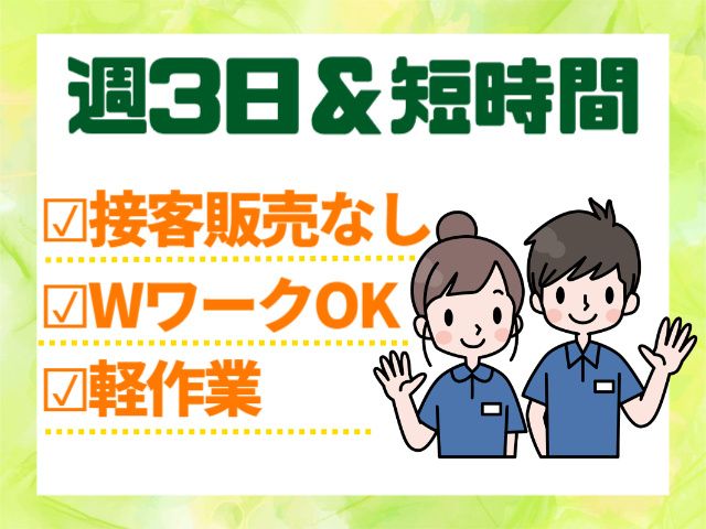 仕事内容 接客・販売業務はありません! 大手ドラッグストアにて商品陳列の軽作業 (朝3時間程度のお仕事です) <シフト制> 出勤は週3日で、時間は1日3時間 「朝の時間を有効活用したい」 「午前中のうちに帰宅して家事やお子さんのお迎え」 などにも時間を使えます。 主婦の方が多く活躍しているお仕事です。 無理せずに働ける希望のシフトを提出してください。 お仕事は先輩スタッフが丁寧に教えていきますので 初めての方でも安心です。 <勤務時間> 5:00~8:00の間で3時間程度 (終了時間変動の場合あり) <1日の流れ> ・夜のうちにお店の倉庫に届いた商品を売場に移動します。 ↓ ・商品を分類ごとに台車に荷分けます。(お菓子、洗剤、化粧品など) ※道具を使って移動するのでらくちんです!! ↓ ・分類ごと台車に分けた商品を売場の棚に並べます。 ※商品のバーコードの数字と値札のバーコードの数字を合わせて並べます。 ↓ ・作業中にでた空段ボール、ボール紙なゴミの回収。 作業に使った道具の片付けします。 ↓ ・当日の作業メンバー全員で手荷物検査を実施し、 備え付けの作業日報へ勤務実績を記入。 ↓ 作業終了! 短時間のお仕事なので、 家事・育児のすきま時間を活用したい主婦(夫)の方 にピッタリ!! 短期勤務不可。