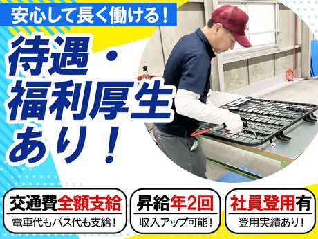 【保険制度】 雇用保険、労災保険、健康保険、厚生年金 待遇・福利厚生 【福利厚生】 ■社会保険完備 ■昇給 更新のタイミング(4月・10月)で昇給のチャンスあり♪ ■正社員登用制度 正社員登用実績あり◎ ■制服貸与 ポロシャツ・ジャンパー・作業ズボン・キャップ・安全靴を貸与! 普段のお洗濯や管理はお任せしますが、傷んだらもちろん交換可能◎ ■きれいな休憩室あり 電子レンジ・冷蔵庫・ウォーターサーバー・電子ポット完備! ■個人ロッカー完備 鍵付きで安心! 男性は縦長、女性は2段に分かれたロッカーです◎ ■髪色自由・ネイルOK 作業に支障がない範囲であればOK! 流行りのインナーカラーやニュアンスネイルなど オシャレも楽しみながら働けます♪ ■塩飴支給 夏に限らず置いてある限りいつでもご自由にどうぞ◎ ■長期休業収入補償・労災上乗せ保険(社保加入者) ケガや病気など、万が一の時も収入をサポート! 通常の補償に「上乗せ」できる安心制度です◎ ■研修制度 最初は先輩がマンツーマンで業務を教えるので安心! 独り立ち後もすぐ近くに先輩や仲間がいるので わからない事や不安な事があったらすぐに聞ける環境です◎ ■バイク・自転車通勤OK 敷地内に無料駐輪場完備!