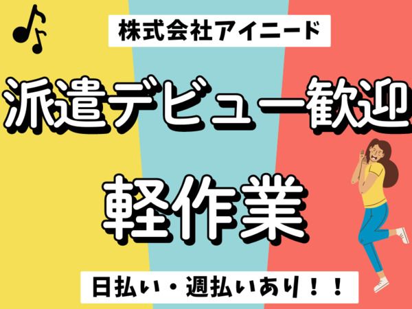 仕事内容 3月スタートのお仕事です! 長期で安定して働きたい方はもちろん、3月~6月末までの短期勤務をご希望の方も歓迎しています! 【仕事内容】 スーパーで販売される人参・じゃがいも・たまねぎなどの野菜を、 決められた数量ごとに袋へ詰めていくお仕事です! 作業はとてもシンプルで、特別な経験や知識は一切必要ありません! 最初は周りのスタッフが丁寧に教えてくれるので、 未経験の方やお仕事にブランクのある方でも安心して始められます。 勤務時間は8時から15時まで! 日中の時間帯でしっかり働きたい方におすすめです◎ 重たい作業はほとんどなく、夏場は冷房完備の快適な職場! こつこつ・もくもくと作業が好きな方にはピッタリのお仕事です! :+:・-・:+:・-・:+:・-・:+:・-・:+:・-・:+: 【見学OK】 事前に倉庫内見学できますので、職場の雰囲気やお仕事内容を確認してからお仕事スタートできますよ! お仕事も丁寧に教えていきますので、未経験者の方も安心してください! :+:・-・:+:・-・:+:・-・:+:・-・:+:・-・:+: 【日払い・週払いシステム】 アイニードは勤怠実績に応じ、給与の一部を 日払い・週払いでもお支払い可能♪ 困った時でも最短2日で受け取ることが出来ます♪ 残りの分は給与日にまとめてお支払いします◎ 応募の前に詳しく聞きたいという方も遠慮なく問い合わせください! :+:・-・:+:・-・:+:・-・:+:・-・:+:・-・:+: 【応募&お問い合わせ】 細かいことでもお気軽にお問い合わせください♪ ご応募は応募フォームかお電話、ショートメッセージでもOKです。 気になったらとりあえずご応募いただいて、それからご検討してもらってもOK お仕事探しをサポートいたします! :+:・-・:+:・-・:+:・-・:+:・-・:+:・-・:+: