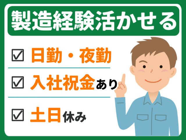 仕事内容 <入社祝い金6万円支給!> (6ヶ月間入社1ヶ月毎に1万円ずつ支給) コツコツモクモク作業が 好きな方にオススメです! 20代・30代・40代・50代など 幅広く活躍中! 医療衛生材料 (医療用テーピング、スポーツ用テープ)の 製造や検査作業をお願いします。 製造未経験の方も、機械操作など基本的なことから お教えいたしますので、お気軽にご連絡ください。 少し難しそうに見えてしまうかもしれませんが、 未経験でも安心してスタートできます 経験者でなくてももちろんOKです。 休みも充実!長期連休あります!! シフトは1週間交替制です。 <未経験でも安心> 未経験の方もご応募OK! イチから親切・丁寧に指導します。 知識や経験がなくても、業務に必要な 知識は入社後に身につけられますので ご安心ください!周りのスタッフも しっかりサポートしてくれます! <応募資格不問です> 経験・年齢・学歴不問! ブランクのある方 第二新卒もOK!社会人経験は不問です。 他社派遣会社に登録中の方や、 今は別のお仕事をされていて 退職後から働き始めたいという方も 応募可能です! 現場での不安ごとや悩みも、 ぜひ当社社員にお気軽に相談してください。 アナタからのご応募お待ちしております!