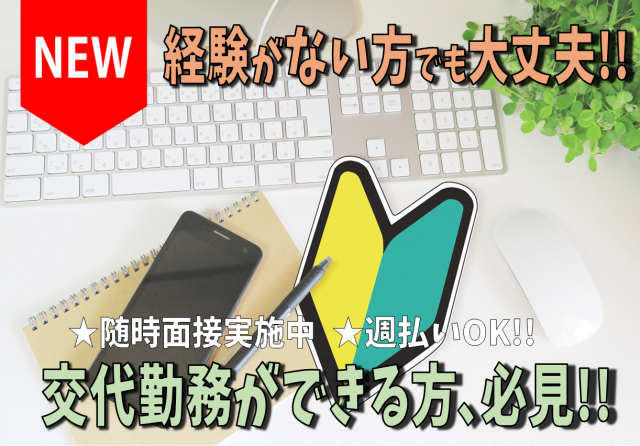 【保険制度】 雇用保険、労災保険、健康保険、厚生年金 待遇 <福利厚生・制度> ■社会保険完備 (※即日加入) ■交通費支給(規定有) ■有給休暇制度 ■定期健康診断 ■キャリアアップ支援制度 <職場環境・待遇> ■男女スタッフ活躍中 ■20~50代活躍中 ■制服・安全保護具貸与 ■食堂・休憩室・更衣室(ロッカー)有 ■昼食は注文可 ■無料駐車場あり ■未経験OK ■完全週休2日制 ■受動喫煙対策:あり (屋内原則禁煙/喫煙専用室設置) 現地、出張面接いたします! 他、些細なことでも気になる事があれば お気軽にお問い合わせください♪ ■応募 / お問い合わせ 【 0120-117-373 】