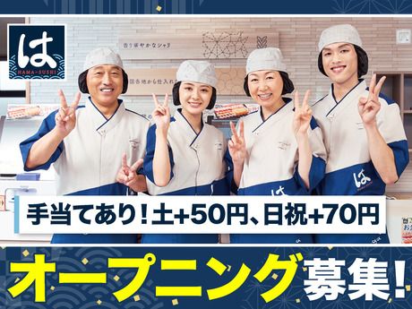 職場環境 【従業員構成】 *はま寿司には色々な働き方をしているスタッフがいます。 ・授業や部活、サークルが終わってから働きたい学生さん ・がっつり稼ぎたいフリーターさん など 毎日のスキマ時間でも、ガッツリフルタイムでも働けるから、家事・育児・学校・趣味との両立がしやすいと好評です。 スキマバイトにもうってつけです! 【職場の雰囲気】 にぎやかな職場 協調性がある 立ち仕事 アットホーム お客様との対話は少ない 長く働ける 力仕事が少ない 自分の都合に合わせやすい 知識、経験不要