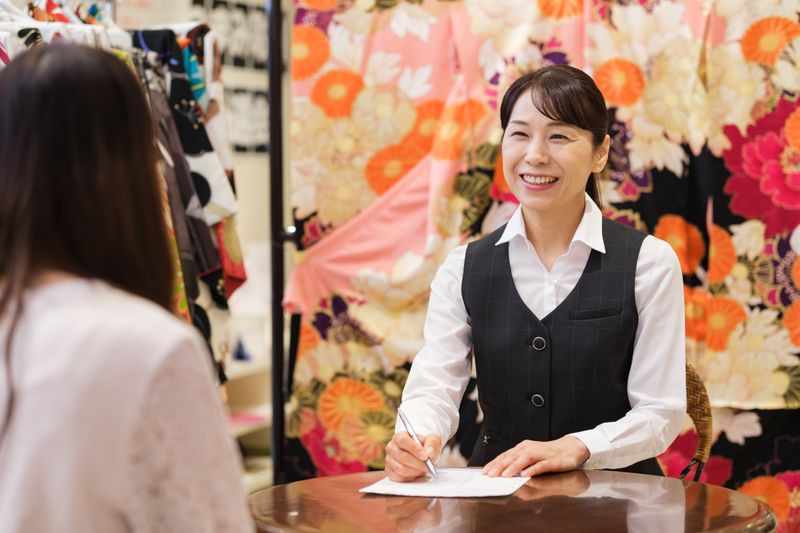 仕事内容 お客様への着物・和装小物の販売とご案内。 <具体的には・・・> ご来店されたお客様へのお声がけ(接客)・販売 展示会やイベントのご案内 出来上がった着物の検品作業 お客様へのDM・ご案内状の送付、電話でのイベントのご案内 和装小物(在庫)の管理(店舗による) その他、着付けの免許取得後(希望者のみ)は講師として教室でのレッスンもお願いします。 ノルマはありません。 <一日の流れ(例)> 朝礼。その日に行う業務の割り当てや、共有事項の確認などを行います。 ↓ 店頭に出て接客しながら、合間に店内のお掃除や整理整頓をします。 ↓ 出来上がった着物が届いたら、検品や採寸。 ↓ お昼休憩。 ↓ 引き続き接客をしつつ、自分が担当しているお客様に送るお手紙を書きます。 イベント前は、DMやご案内状を作ったり、送付済のお客様にお電話をしたりすることも。 ↓ 終礼。お疲れ様でした <研修について> 研修のカリキュラムは一人ひとりのスキルや習熟度を考慮して決めていきます。 2~3ヶ月に一度、本社の育成専門部署によるエリアごとの研修会もあり。 会社全体で成長を後押しするので、安心してご応募ください。